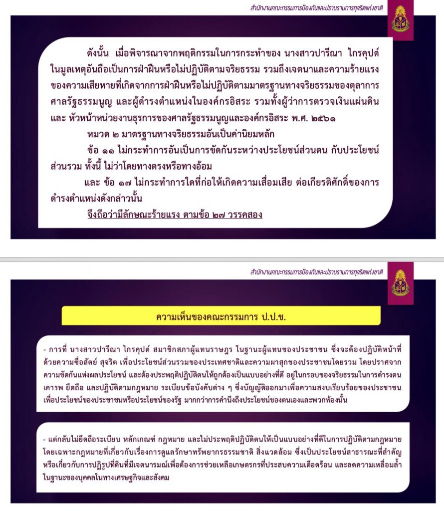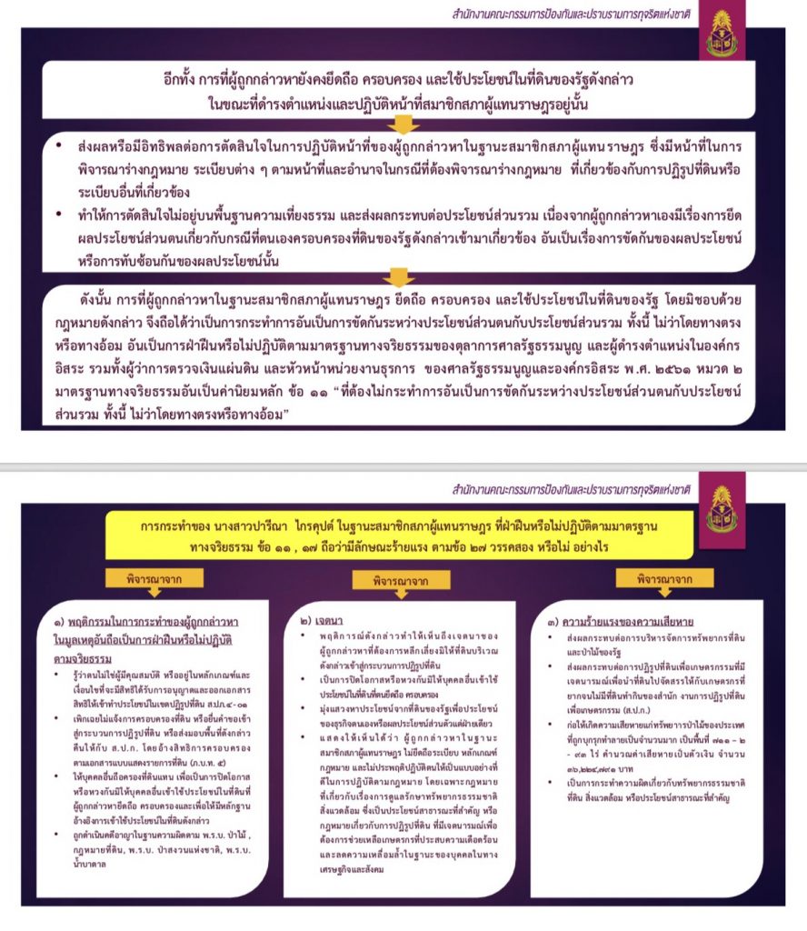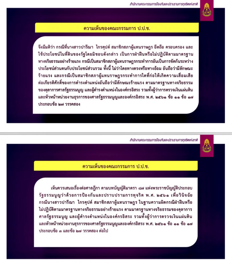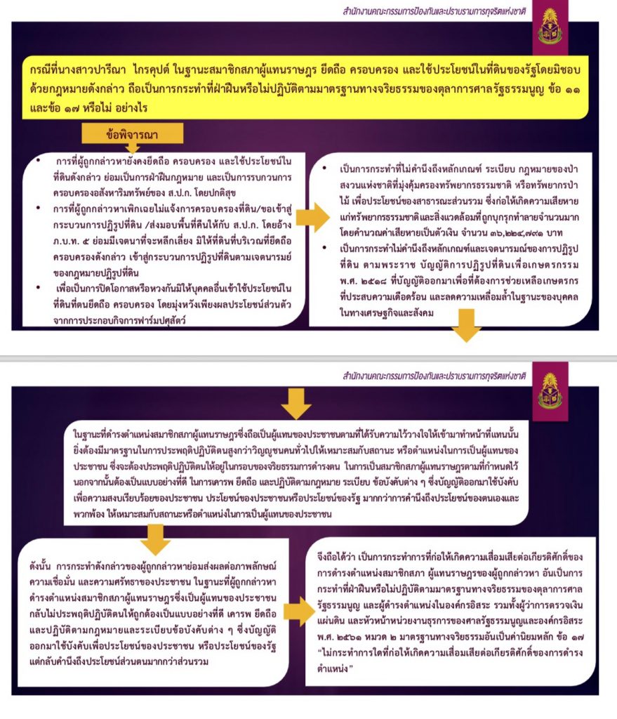 คณะกรรมการ ป.ป.ช. มีมติว่า นางสาวปารีณา ยึดถือ ครอบครอง และใช้ประโยชน์ในที่ดินของรัฐโดยมิชอบดังกล่าว เป็นการฝ่าฝืนหรือไม่ปฏิบัติตามมาตรฐานทางจริยธรรมอย่างร้ายแรง. – สำนักข่าวไทย