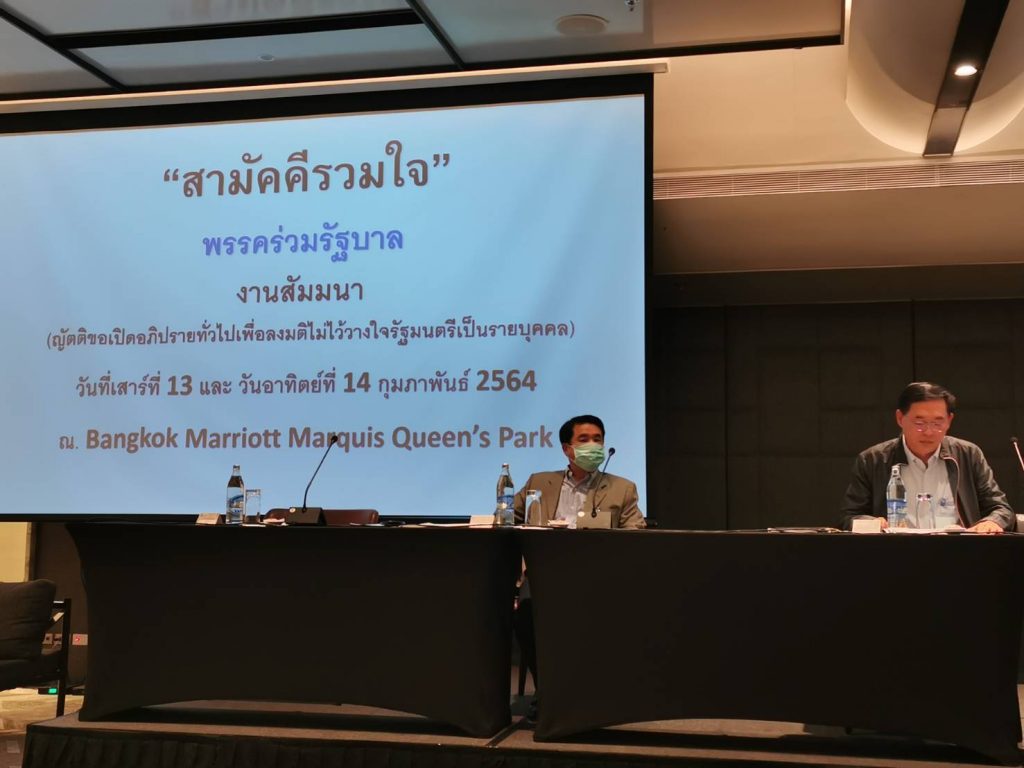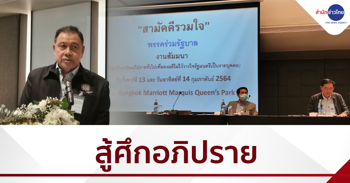 โรงแรมมาริออท 13 ก.พ.- พรรคร่วมรัฐบาลจัดสัมมนาสามัคคีรวมใจ เตรียมพร้อมสู้ศึกอภิปรายไม่ไว้วางใจ “อนุชา-สุชาติ” ยืนยันไม่มีประเด็นใดน่ากังวล ส.ส.พรรคพลังประชารัฐ มีความเป็นเอกภาพ