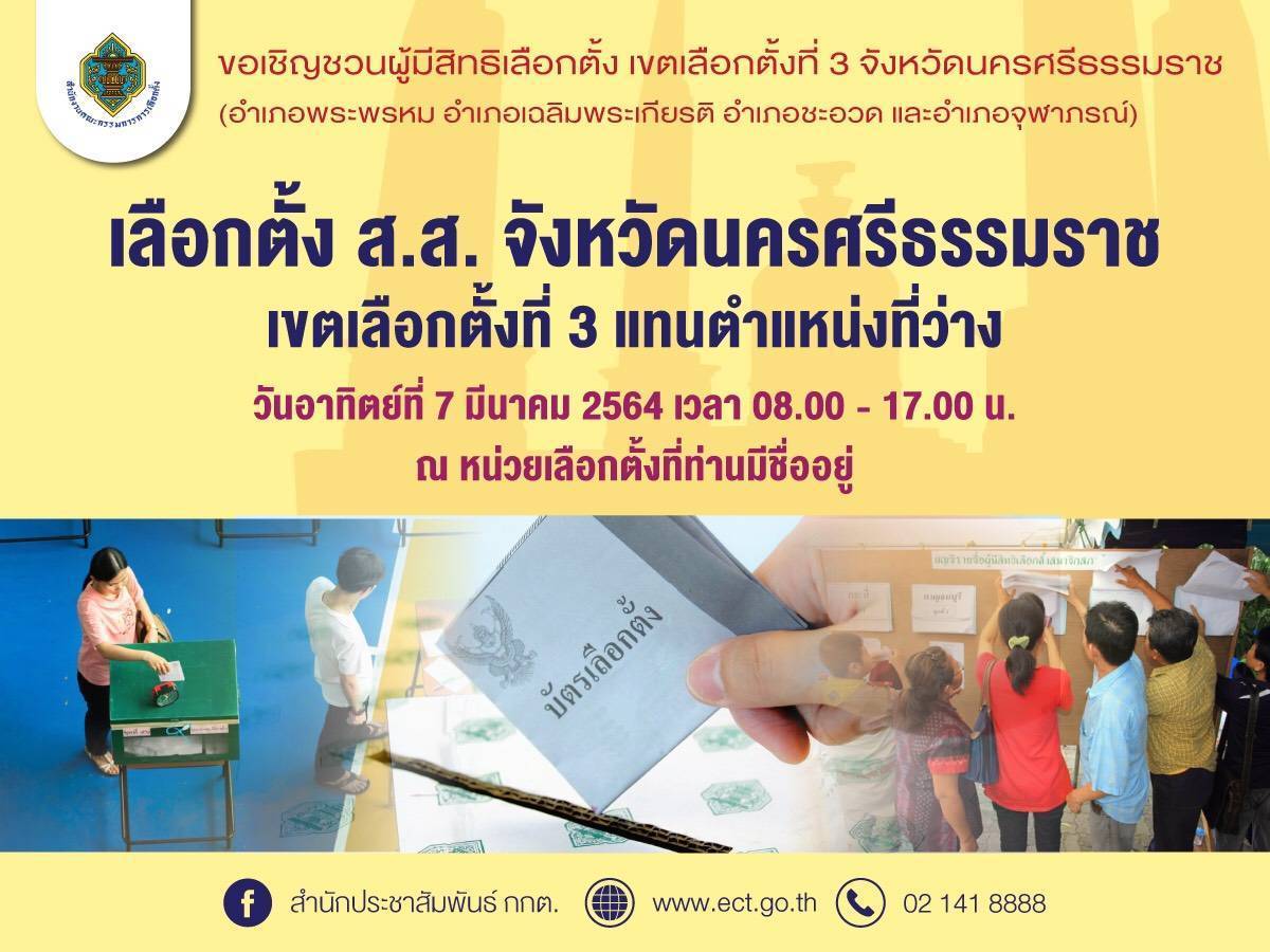 วันนี้ (19 ก.พ.) สำนักงาน กกต. แจ้งว่าตามที่ กกต.กำหนดให้มีการเลือกตั้งซ่อม ส.ส.เขต 3 นครศรีธรรมราช แทนตำแหน่งที่ว่างในวันอาทิตย์ที่ 7 มีนาคมนี้ ขอให้ประชาชนผู้มีสิทธิเลือกตั้งใน อ.พระพรหม อ.เฉลิมพระเกียรติ อ.ชะอวด และ อ.จุฬาภรณ์ ตรวจสอบรายชื่อผู้มีสิทธิเลือกตั้งได้จากเอกสารแจ้งรายชื่อผู้มีสิทธิเลือกตั้งที่มีการจัดส่งไปยังเจ้าบ้าน หากพบว่าตนเองหรือผู้ที่มีชื่ออยู่ในทะเบียนบ้าน ไม่มีรายชื่อในบัญชีรายชื่อผู้มีสิทธิเลือกตั้ง