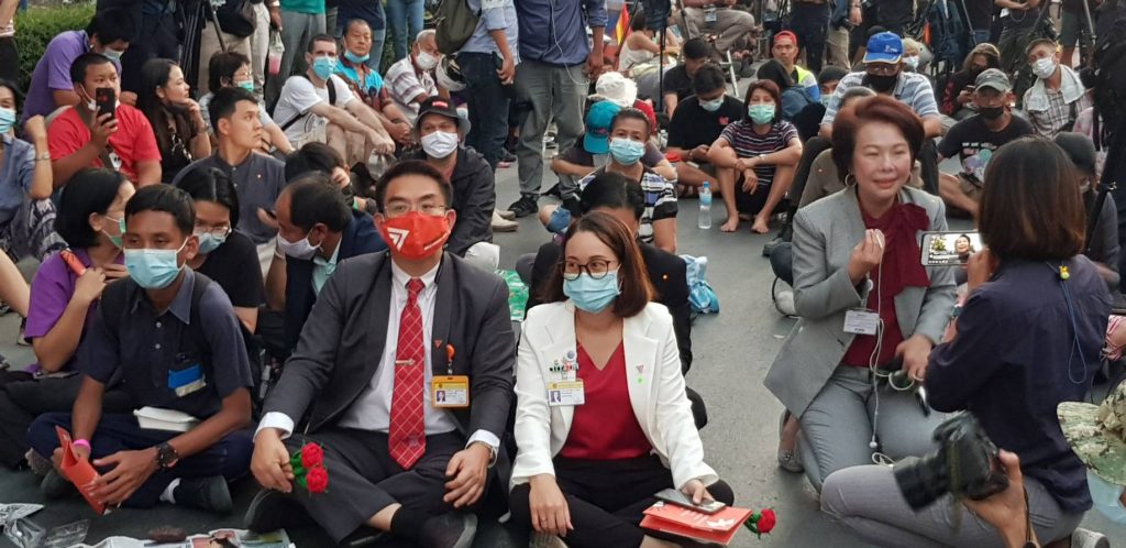 รัฐสภา วันนี้ (19 ก.พ.) ช่วงเย็นที่ผ่านมากลุ่มมวลชน ที่ประกอบด้วย นักเรียน นักศึกษา เยาวชนและประชาชน ทยอยเดินทางมาปักหลักชุมนุมหน้ารัฐสภา เพื่อแสดงพลังไม่ไว้วางใจ และขับไล่ พล.อ.ประยุทธ์ จันทร์โอชา นายกรัฐมนตรี ตามที่ กลุ่ม Mob Fest นำโดย น.ส.สุกรียา วรรณายุวัฒน์ นิสิตคณะครุศาสตร์ จุฬาลงกรณ์มหาวิทยาลัย นัดหมายจัดการชุมนุม โดยคณะแกนนำผู้ชุมนุมได้นำรถกระจายเสียงไปตั้งเวทีปราศรัยปิดการจราจรถนนสามเสน ขาเข้า บริเวณฝั่งตรงข้าม บริษัท สามเสนบริวเวอรี่ จำกัด 2 ช่องจราจร ห่างจากหน้าทางเข้ารัฐสภากว่า 100 เมตร พร้อมทำการคัดกรองคนไม่ให้นำอาวุธเข้าพื้นที่การชุมนุม และวัดไข้ผู้มาร่วมชุมนุมตามมาตรการป้องกันโรคด้วย โดยมี 3 ส.ส.พรรคก้าวไกล ได้แก่ นายณัฐวุฒิ บัวประทุม ส.ส.บัญชีรายชื่อ นายวิโรจน์ ลักขณาอดิศร ส.ส.บัญชีรายชื่อ และนางอมรรัตน์ โชคปมิตต์กุล ส.ส.บัญชีรายชื่อ มาร่วมสังเกตการณ์การชุมนุม ขณะที่บรรยากาศโดยรอบอาคารรัฐสภา ทางเจ้าหน้าที่ตำรวจ ได้เตรียมตรึงกำลังเจ้าหน้าที่ตำรวจควบคุมฝูงชน 12 กองร้อย รวมถึงรถฉีดน้ำแรงดันสูง 6 คัน เพื่อรับมือกับการชุมนุม