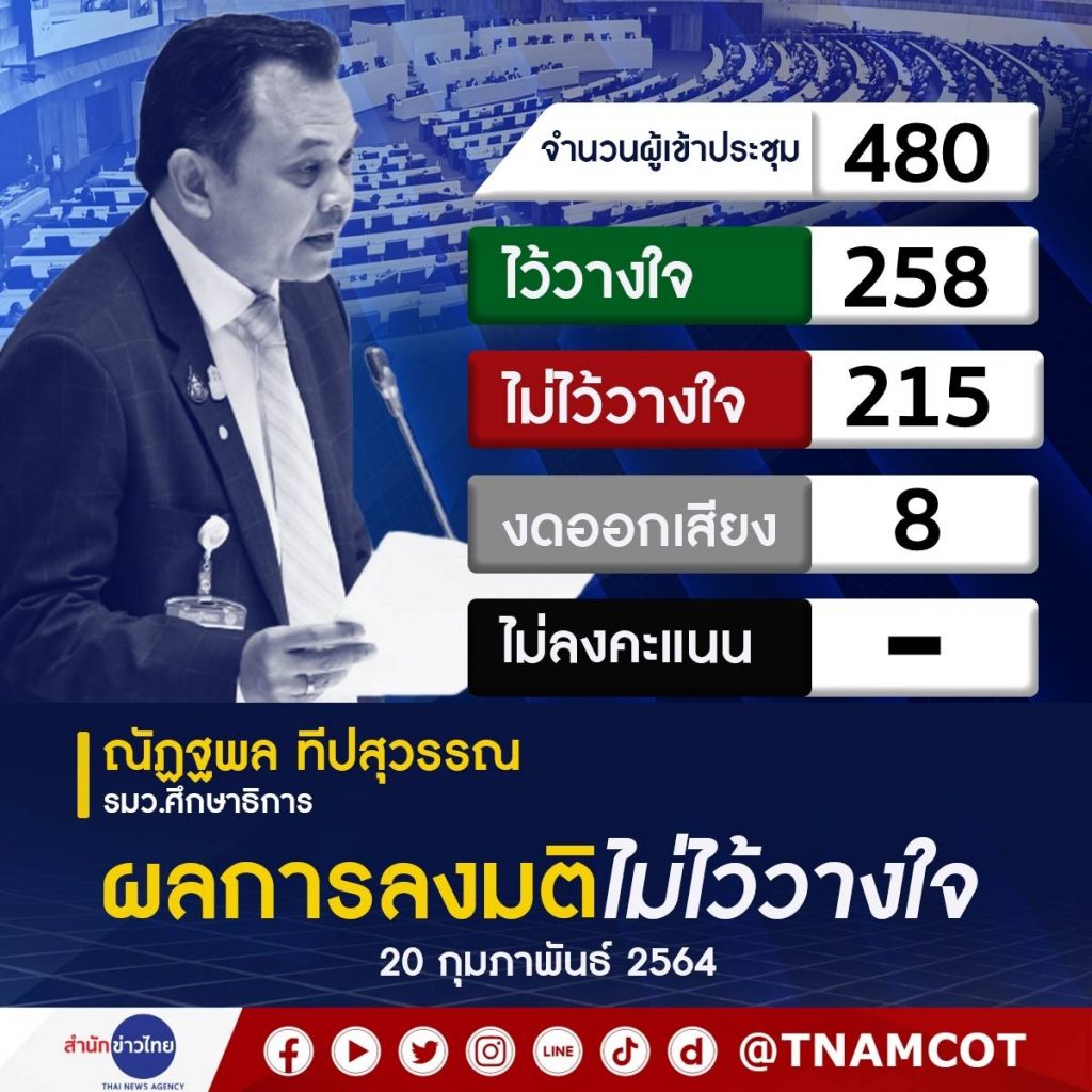 นายณัฏฐพล ทีปสุวรรณ รมว.ศึกษาธิการ ไว้วางใจ 258 ไม่ไว้วางใจ 214 งดออกเสียง 8 ไม่ลงคะแนน 0