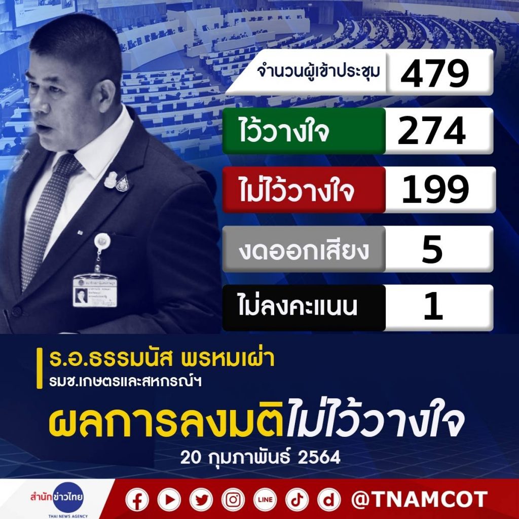 ร้อยเอกธรรมนัส พรหมเผ่า รมช.เกษตรและสหกรณ์ ไว้วางใจ 274 ไม่ไว้วางใจ 199 งดออกเสียง 5 ไม่ลงคะแนน 1