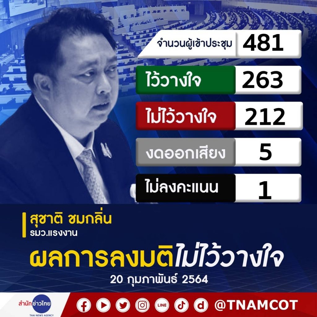 นายสุชาติ ชมกลิ่น รมว.แรงงาน ไว้วางใจ 263 ไม่ไว้วางใจ 212 งดออกเสียง 5 ไม่ลงคะแนน 1