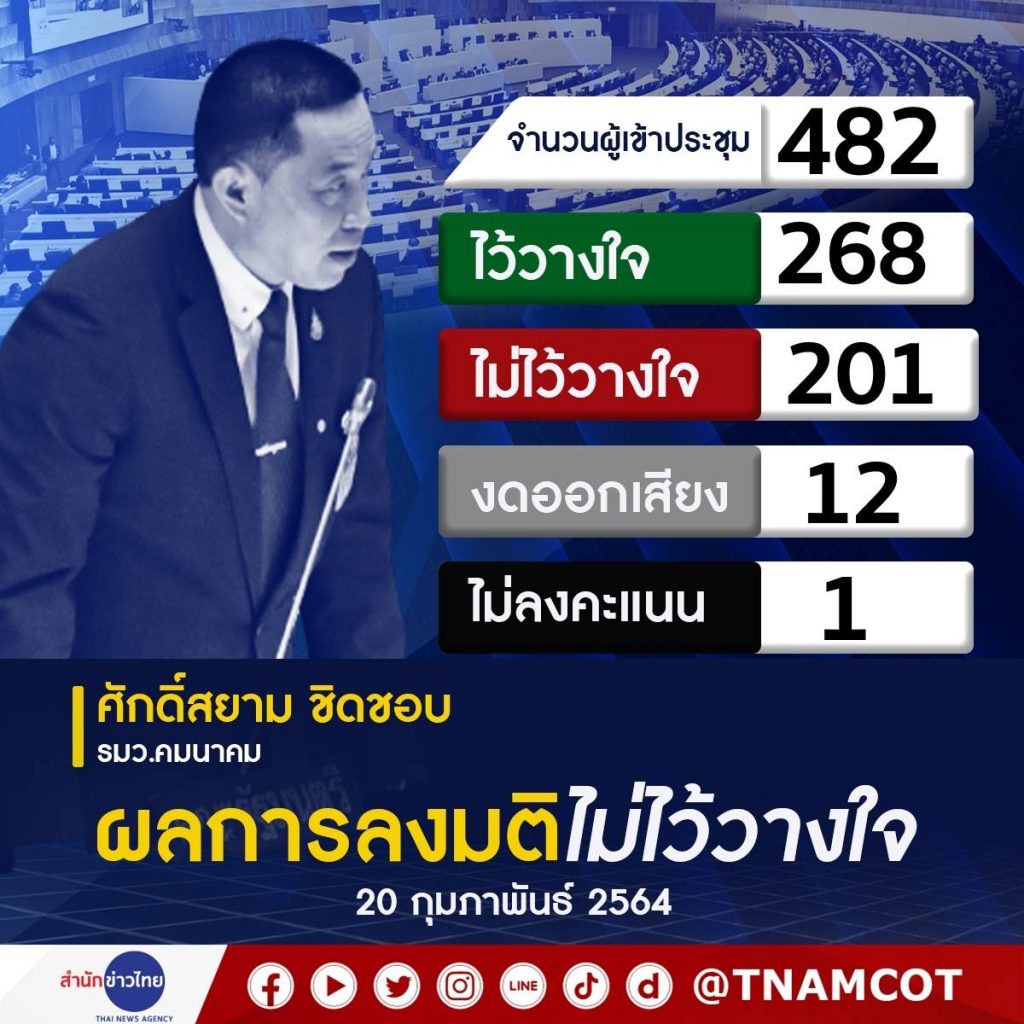 นายศักดิ์สยาม ชิดชอบ รมว.คมนาคม ไว้วางใจ 268ไม่ไว้วางใจ 201 งดออกเสียง 12 ไม่ลงคะแนน 1