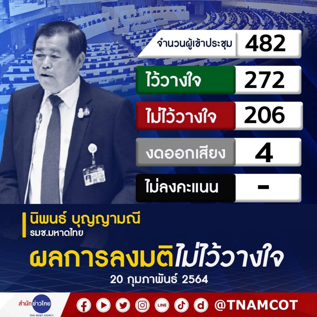 นายนิพนธ์ บุญญามณี รมช.มหาดไทย ไว้วางใจ 272 ไม่ไว้วางใจ 206 งดออกเสียง 4 ไม่ลงคะแนน 0
