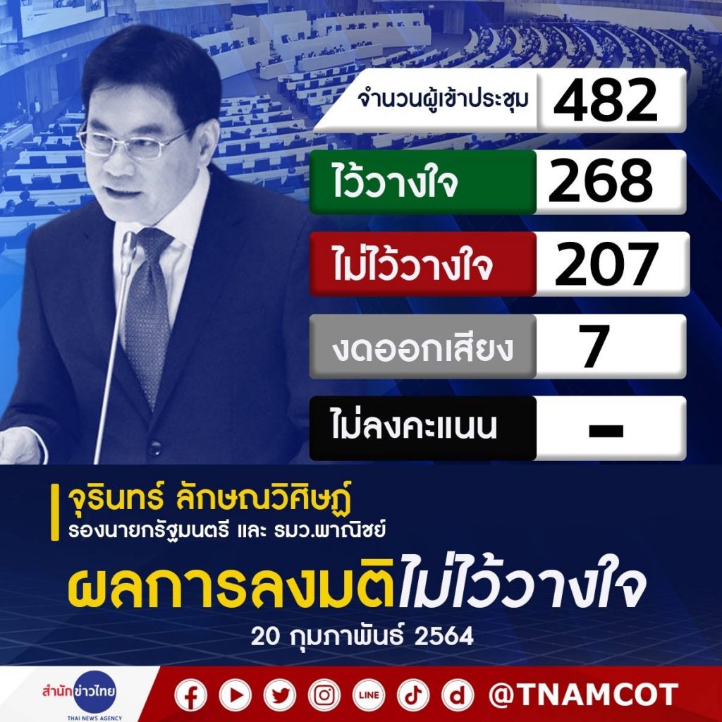 นายจุรินทร์ ลักษณวิศิษฏ์ รองนายกรัฐมนตรี และ รมว.พาณิชย์ ไว้วางใจ 268 ไม่ไว้วางใจ 207 งดออกเสียง 7 ไม่ลงคะแนน 0