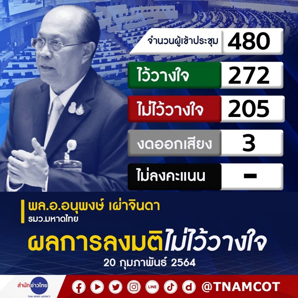 พล.อ.อนุพงษ์ เผ่าจินดา รมว.มหาดไทย ไว้วางใจ 272 ไม่ไว้วางใจ 205 งดออกเสียง 3 ไม่ลงคะแนน 0