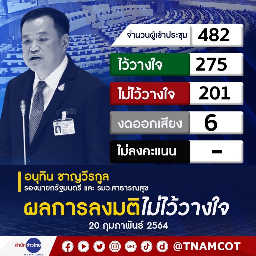 นายอนุทิน ชาญวีรกูล รองนายกรัฐมนตรี และ รมว.สาธารณสุข ไว้วางใจ 275 ไม่ไว้วางใจ 201 งดออกเสียง 6 ไม่ลงคะแนน 0