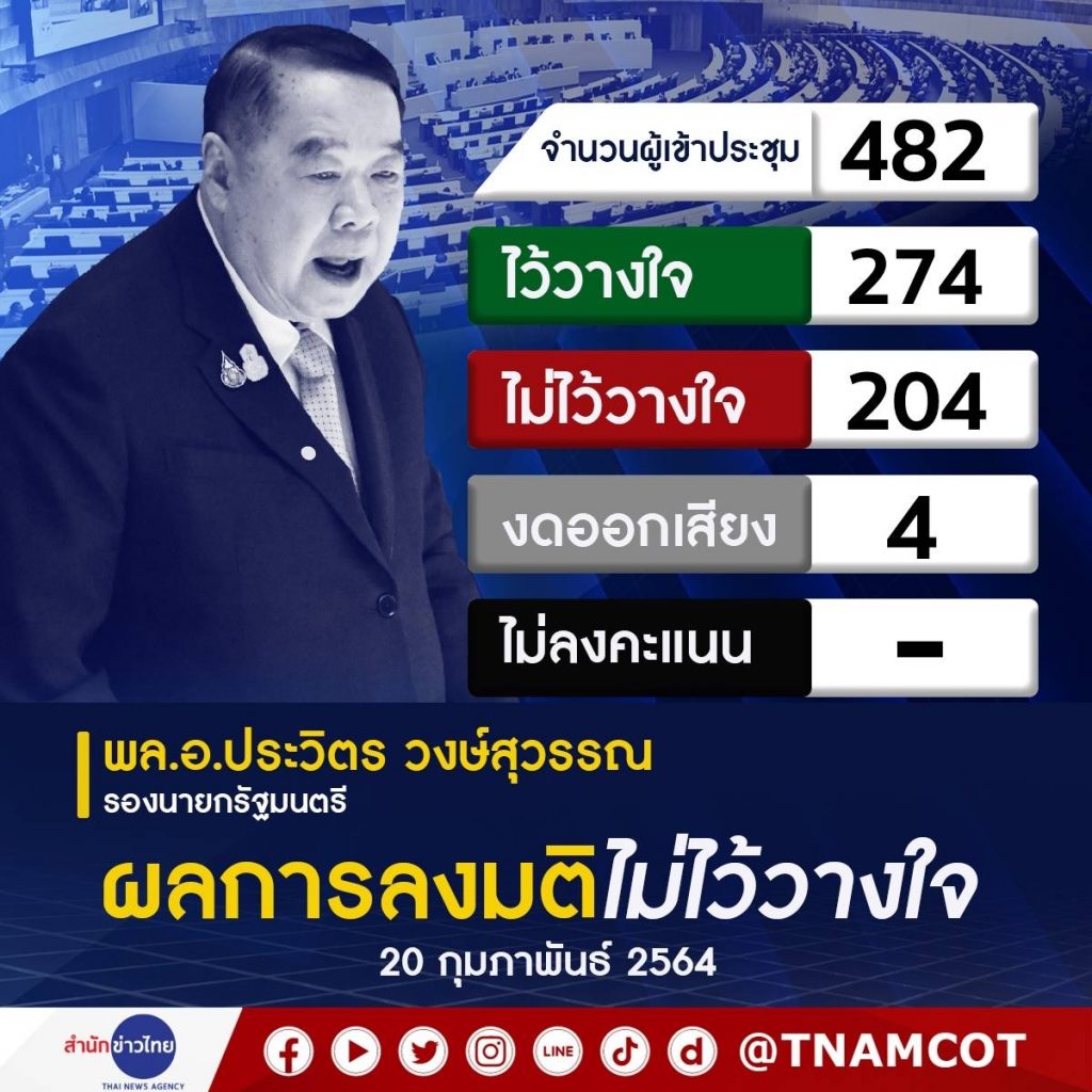 พล.อ.ประวิตร วงษ์สุวรรณ รองนายกรัฐมนตรี ไว้วางใจ 274 ไม่ไว้วางใจ 204 งดออกเสียง 4 ไม่ลงคะแนน 0