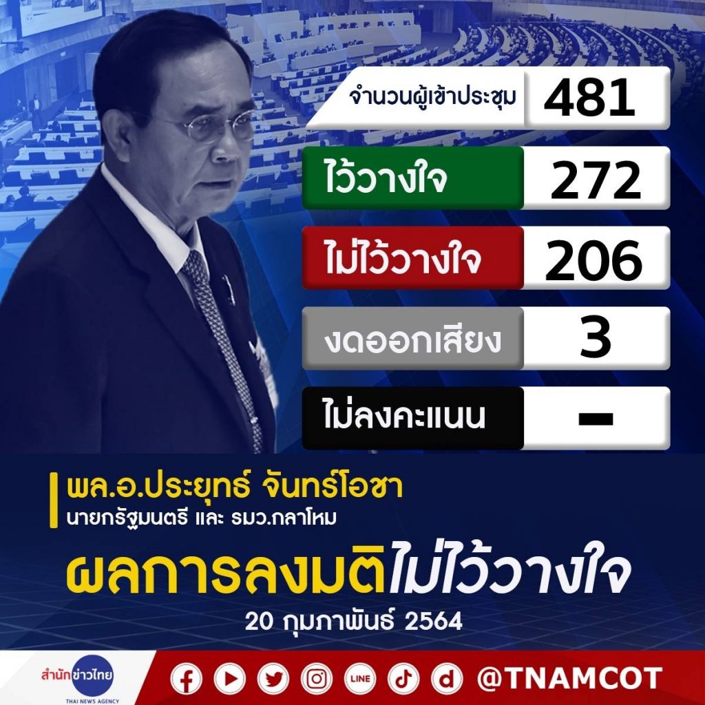 พล.อ.ประยุทธ์ จันทร์โอชา นายกรัฐมนตรี และ รมว.กลาโหม ไว้วางใจ 272 ไม่ไว้วางใจ 206 งดออกเสียง 3 ไม่ลงคะแนน 0
