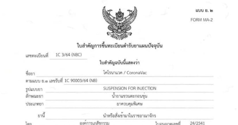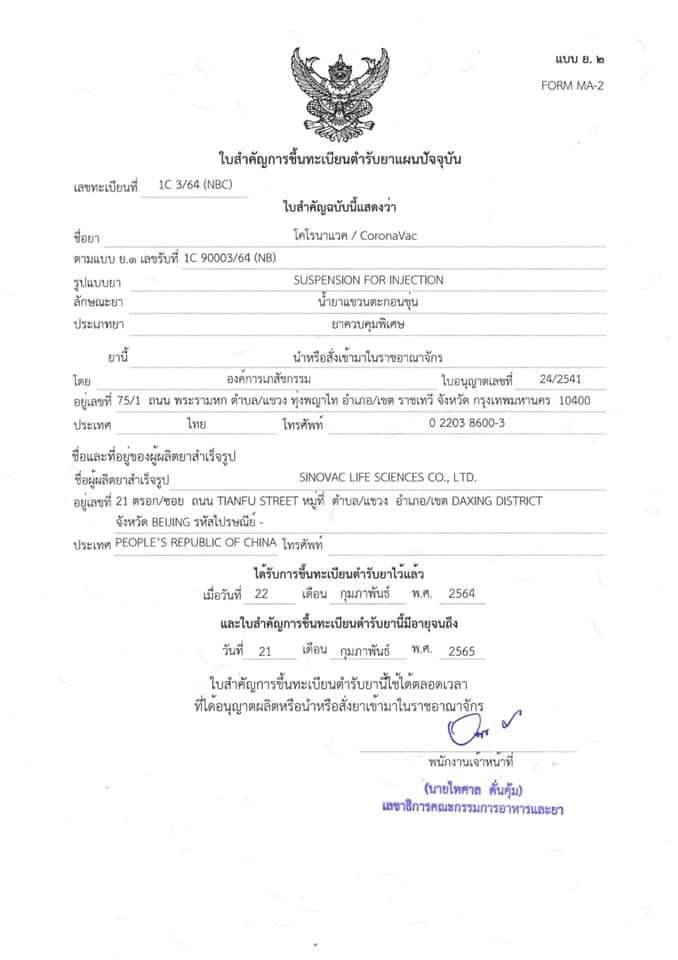 นายอนุทิน ชาญวีรกูล รองนายกรัฐมนตรี และรัฐมนตรีว่าการกระทรวงสาธารณสุข โพสต์เฟซบุ๊กส่วนตัว “Anutin Charnvirakul” ระบุถึงความคืบหน้าเรื่องการนำเข้าวัคซีนจากประเทศจีน โดยเปิดเผยภาพเอกสารวัคซีนยี่ห้อ Sinovac ที่ผ่านการประเมินจากองค์การอาหารและยาแล้ว พร้อมข้อความว่า “Just in time” #ใบขึ้นทะเบียนวัคซีนซิโนแวค #คนไทยต้องปลอดภัย