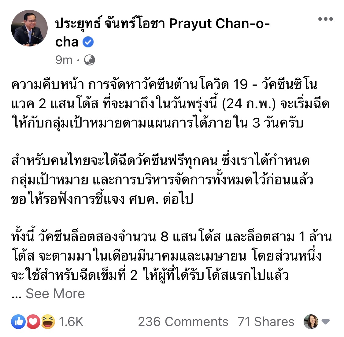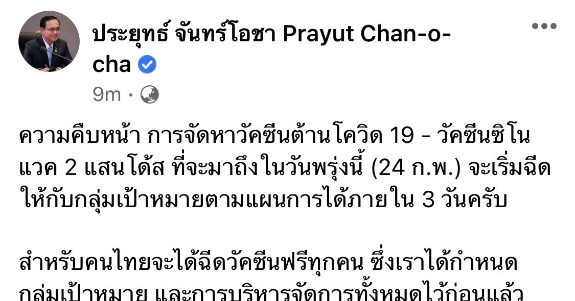 พล.อ.ประยุทธ์ จันทร์โอชา นายกรัฐมนตรีและรัฐมนตรีว่าการกระทรวงกลาโหม โพสต์ข้อความผ่านเฟซบุ๊ก “ประยุทธ์ จันทร์โอชา Prayut Chan-o-cha” เรื่องความคืบหน้าการจัดหาวัคซีนต้านโควิด 19 – วัคซีนซิโนแวค 2 แสนโดส ที่จะมาถึงในวันพรุ่งนี้ (24 ก.พ.) ว่าจะเริ่มฉีดให้กับกลุ่มเป้าหมายตามแผนการได้ภายใน 3 วัน โดยคนไทยจะได้ฉีดวัคซีนฟรีทุกคน ซึ่งได้กำหนดกลุ่มเป้าหมาย และการบริหารจัดการทั้งหมดไว้ก่อนแล้ว ขอให้รอฟังการชี้แจง ศบค. ต่อไป