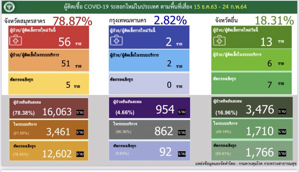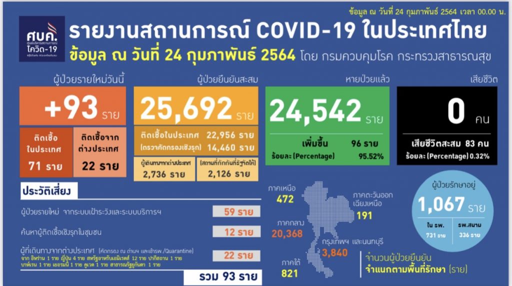 กรุงเทพฯ 24 ก.พ.-ศบค.ไทยป่วยโควิด-19 ใหม่ 93 ราย ติดในประเทศ 71 ราย กลับจากตปท. 22 ราย หายป่วยกลับบ้านเพิ่ม 96 ราย จ.สมุทรสาครยังมากสุด
