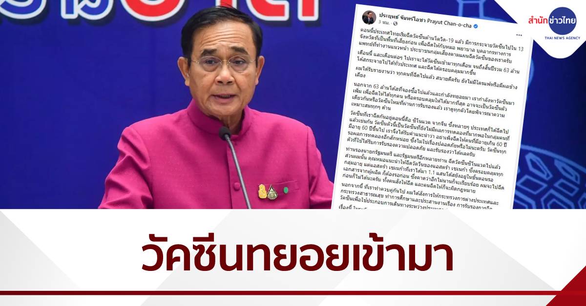 พล.อ.ประยุทธ์ จันทร์โอชา นายกรัฐมนตรีและรัฐมนตรีว่าการกระทรวงกลาโหม โพสต์เฟสบุ๊กชี้แจงความคืบหน้าการฉีดวัคซีนโควิด -19 ของไทย ว่า ขณะนี้ประเทศไทยเริ่มฉีดวัคซีนต้านโควิด-19 แล้ว โดยกระจายวัคซีนไปใน 13 จังหวัดที่เป็นพื้นที่เสี่ยงก่อน เพื่อฉีดให้กับหมอ พยาบาล บุคลากรทางการแพทย์ที่ทำงานแนวหน้า ประชาชนกลุ่มเสี่ยงตามแผนฉีดวัคซีนของเรา