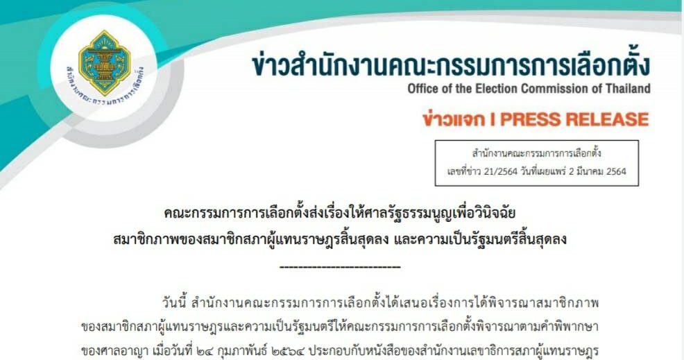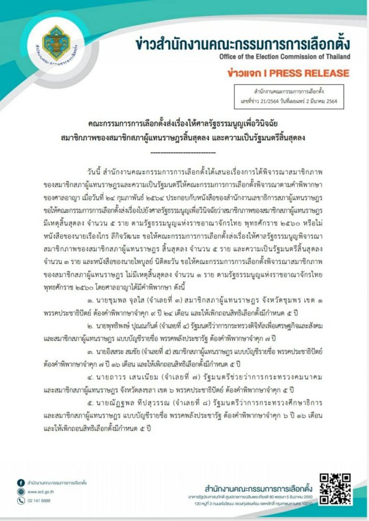 ผู้สื่อข่าวรายงานว่าสำนักงานคณะกรรมการการเลือกตั้ง (กกต.) ได้เผยแพร่เอกสารข่าว กรณีเสนอเรื่องการพิจารณาสมาชิกภาพของ ส.ส. และความเป็นรัฐมนตรีให้คณะกรรมการการเลือกตั้งพิจารณา ตามคำพิพากษาของศาลอาญา เมื่อวันที่ 24 กุมภาพันธ์ ประกอบด้วย นายชุมพล จุลใส ส.ส.จังหวัดชุมพร เขต 1 พรรคประชาธิปัตย์ นายพุทธิพงษ์ ปุณณกันต์ รัฐมนตรีว่าการกระทรวงดิจิทัลเพื่อเศรษฐกิจและสังคม ส.ส.บัญชีรายชื่อ พรรคพลังประชารัฐ นายอิสสระ สมชัย ส.ส.บัญชีรายชื่อ พรรคประชาธิปัตย์ นายถาวร เสนเนียม รัฐมนตรีช่วยว่าการกระทรวงคมนาคม ส.ส. จังหวัดสงขลา เขต 6 พรรคประชาธิปัตย์ และนายณัฏฐพล ทีปสุวรรณ รัฐมนตรีว่าการกระทรวงศึกษาธิการ ส.ส.บัญชีรายชื่อ พรรคพลังประชารัฐ