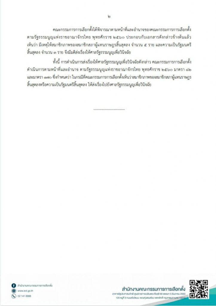 คณะกรรมการการเลือกตั้งได้พิจารณาตามหน้าที่และอำนาจ ตามรัฐธรรมนูญ ประกอบกับเอกสารคำร้อง เห็นว่า มีเหตุให้สมาชิกภาพของสมาชิกสภาผู้แทนราษฎรสิ้นสุดลง 5 ราย และความเป็นรัฐมนตรีสิ้นสุดลง 3 ราย จึงมีมติส่งเรื่องให้ศาลรัฐธรรมนูญเพื่อวินิจฉัย ตามมาตรา 82 และมาตรา 170 ของรัฐธรรมนูญ ซึ่งกำหนดว่า ในกรณีที่ กกต.เห็นว่าสมาชิกภาพของ ส.ส.สิ้นสุดลงหรือความเป็นรัฐมนตรีสิ้นสุดลง ให้ส่งเรื่องไปยังศาลรัฐธรรมนูญเพื่อวินิจฉัย.-สำนักข่าวไทย