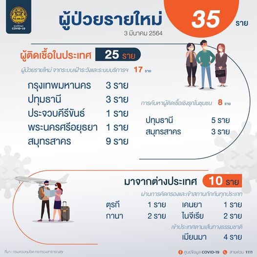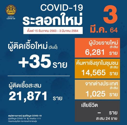 นพ.ทวีศิลป์ วิษณุโยธิน โฆษกศูนย์บริหารสถานการณ์การแพร่ระบาดของโรคติดเชื้อไวรัสโคโรน่า 2019 (โควิด-19) หรือ ศบค. รายงานตัวเลขผู้ติดเชื้อโควิด 19 วันนี้(3 มี.ค.) ว่า เพิ่มขึ้น 35 ราย ผู้ป่วยยืนยันสะสม 26,108 ราย หายป่วยแล้ว 25,483 ราย รักษาตัวอยู่ที่โรงพยาบาล 541 ราย ผู้เสียสะสมรวม 83 คน ผู้ป่วยยืนยันสะสมระลอกใหม่ตั้งแต่วันที่ 15 ธันวาคม 2563 – 3 มีนาคม 2564 จำนวน 21,871 ราย โดยผู้ติดเชื้อที่เพิ่มขึ้น 35 ราย เป็นผู้ที่ติดเชื้อในประเทศ 25 ราย เป็นผู้ป่วยรายใหม่จากระบบเฝ้าระวังและบริการ 17 ราย จากการค้นหาเชิงรุกในชุมชน 8 ราย เป็นผู้ที่เดินทางจากต่างประเทศ 10 ราย จากตุรกี 1 ราย กานา 2 ราย เคนยา 1 ราย ไนจีเรีย 2 รายและเมียนมา 4 ราย