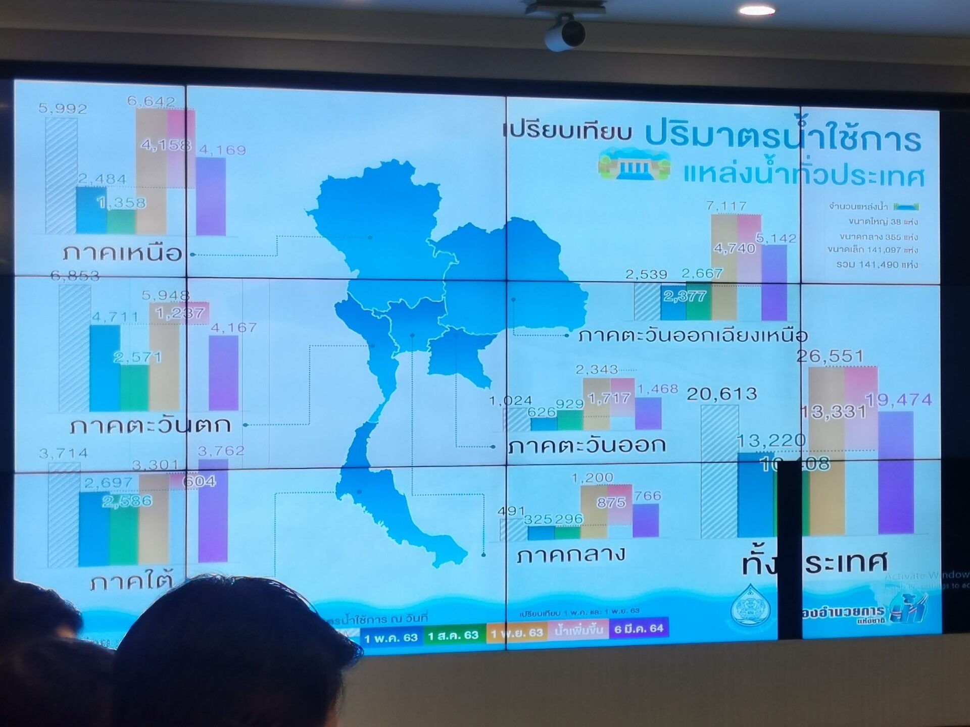 “ที่ประชุมวันนี้ติดตามการดำเนินงานตามมาตรการรองรับสถานการณ์ขาดแคลนน้ำฤดูแล้ง ปี 2563/64 ซึ่งมีผลการดำเนินการที่สำคัญ อาทิ การเร่งเก็บน้ำในแหล่งน้ำต่างๆ พบว่าตั้งแต่ 1 พ.ย.63 – 28 ก.พ.64 กักเก็บได้เพิ่มขึ้น 2,947 ล้านลบ.ม. 2. การจัดหาแหล่งสำรองน้ำดิบเพื่อป้องกันผลกระทบในพื้นที่เสี่ยงขาดแคลนน้ำ ซึ่งพบว่า ในเขตการประปาส่วนภูมิภาค (กปภ.) ยังไม่มีสถานการณ์ขาดแคลนน้ำ ขณะที่นอกเขตกปภ. มีพื้นที่เฝ้าระวังขาดแคลนน้ำ 42 จังหวัด 22 อำเภอ 41 ตำบล พบว่ามีพื้นที่เฝ้าระวังเพิ่มอีก 2 จังหวัด ได้แก่ จ.เพชรบูรณ์และจ.ลำปาง” นายสำเริง กล่าว