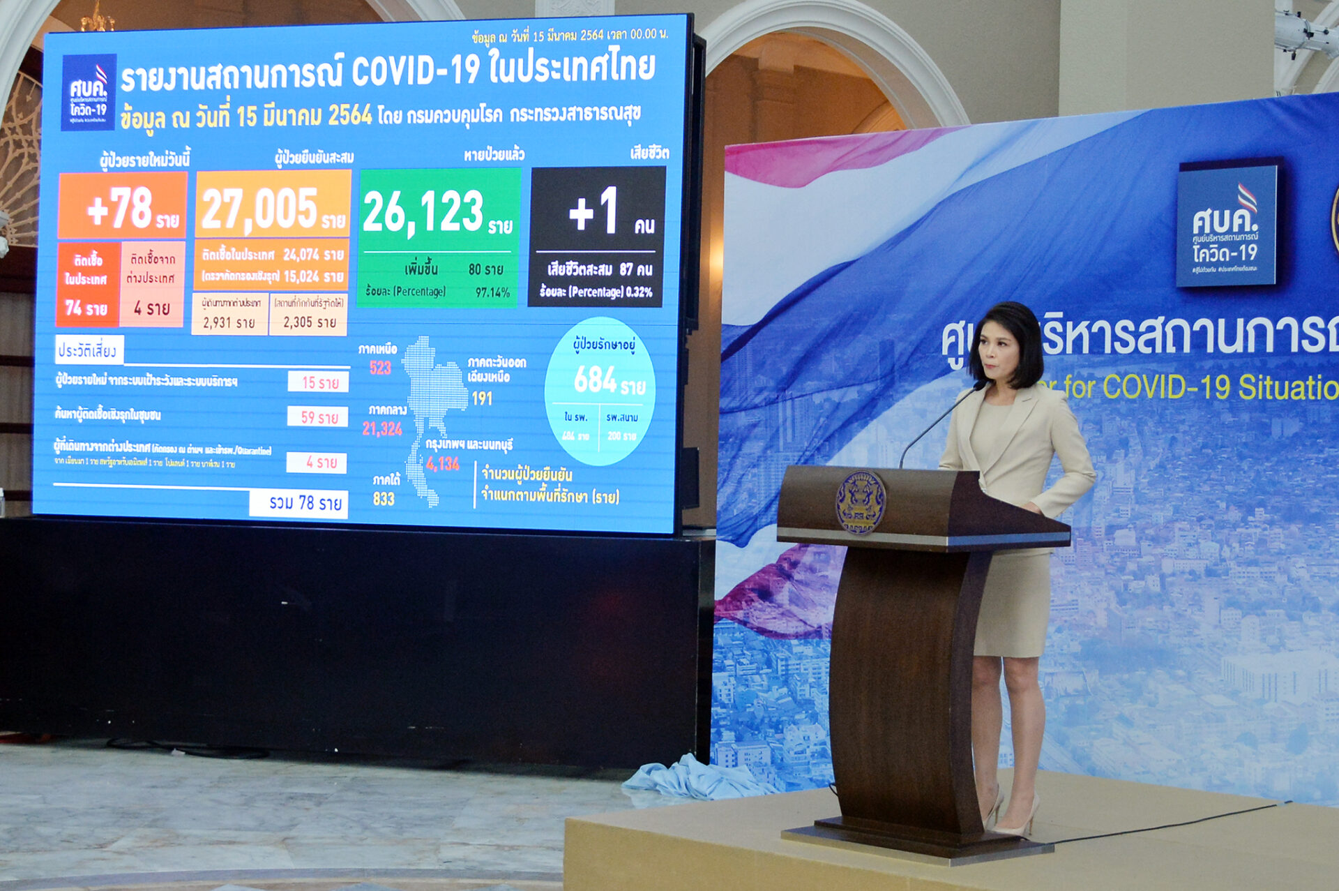 พญ.อภิสมัย ศรีรังสรรค์ ผู้ช่วยโฆษกศูนย์บริหารสถานการณ์การแพร่ระบาดของโรคติดเชื้อไวรัสโคโรน่า 2019 (โควิด-19) หรือ ศบค. รายงานตัวเลขผู้ติดเชื้อโควิด 19 วันนี้(15 มี.ค.) เพิ่มขึ้น 79 ราย ผู้ป่วยยืนยันสะสม 27,005 ราย หายป่วยแล้ว 26,123 ราย รักษาตัวอยู่ที่โรงพยาบาล 684 ราย เสียชีวิตเพิ่ม 1 คน ผู้เสียชีวิตสะสมรวม 87 คน ผู้ป่วยยืนยันสะสมละระลอกใหม่ตั้งแต่วันที่ 15 ธันวาคม 2563 – 15 มีนาคม 2564 จำนวน 22,057 ราย