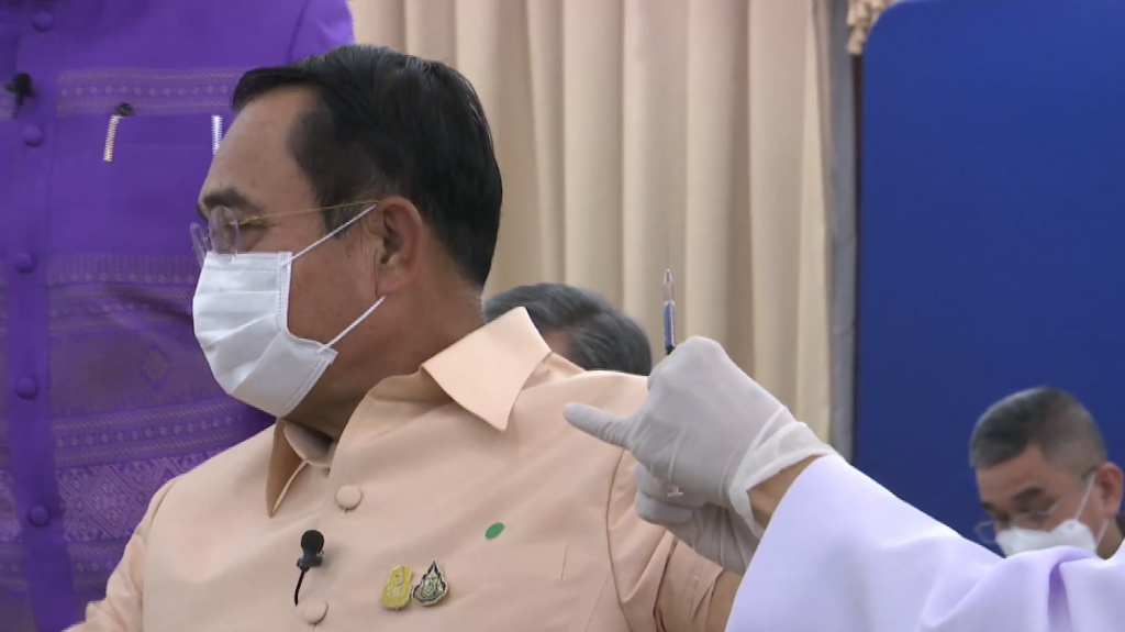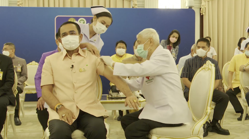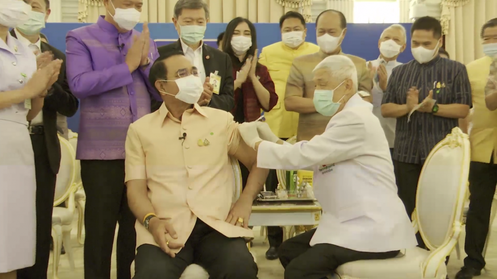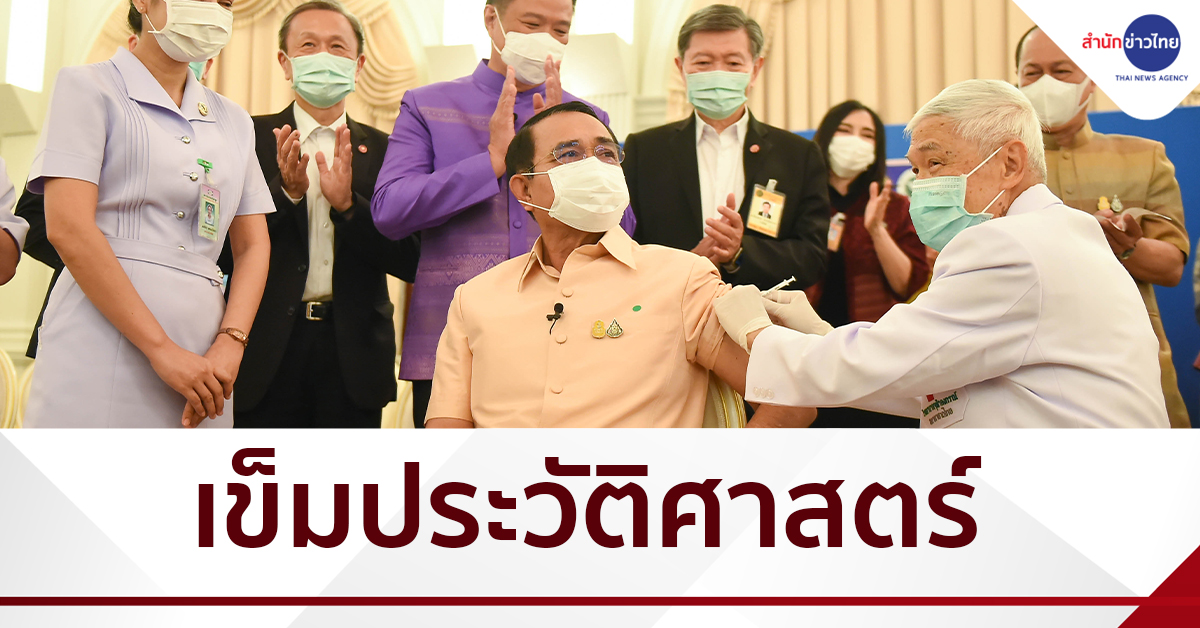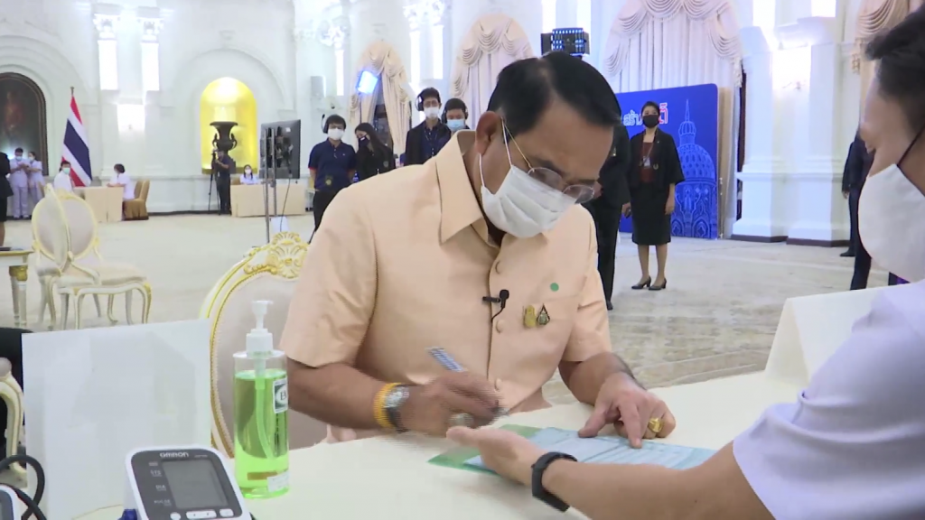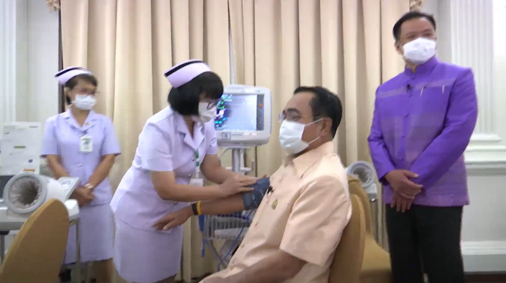พล.อ.ประยุทธ์ จันทร์โอชา นายกรัฐมนตรีและรัฐมนตรีว่าการกระทรวงกลาโหม เข้าสู่ขั้นตอนการฉีดวัคซีน ที่จัดขึ้นในตึกสันติไมตรีหลังใน เริ่มจากการการทำประวัติ ชั่งน้ำหนัก วัดความดัน ความดันนายกรัฐมนตรีวันนี้อยู่ที่ 157/88 แพทย์ระบุว่าความดันปกติ ส่วนน้ำหนักอยู่ที่ 83.1 กิโลกรัม และวัคซีนลอตที่ A1 CTMAV509 ผู้ที่ฉีดวัคซีนให้กับนายกรัฐมนตรีคือ นายแพทย์ยง ภู่วรวรรณ ฉีดเข้าที่กล้ามแขนของนายกรัฐมนตรี โดยนายกรัฐมนตรี เตรียมพร้อมใส่เสื้อแขนสั้นมา นายกรัฐมนตรี บรรยายความรู้สึกขณะฉีด และบอกว่าฉีดไม่เจ็บ หลังฉีดนายกรัฐมนตรีกล่าวให้ความมั่นใจว่าการฉีดวันนี้เป็นการสร้างความมั่นใจให้คนไทย ว่า ฉีดวัคซีนที่รัฐบาลเตรียมไว้ เป็นวัคซีนที่เหมาะกับคนไทย โดยแอสตราเซเนกาได้รับการยืนยันจากองค์การอนามัยโลกว่าปลอดภัย จากนี้จะเพิ่มขีดความสามารถในการฉีดให้มากขึ้น ขอให้ฟังหมอเป็นหลัก กำชับประชาชนไปในพื้นที่เสี่ยง แม้จะรับวัคซีนแล้วก็ตาม และขอให้รอติดตามมาตรการผ่อนคลายในช่วงสงกรานต์ ในวันศุกร์นี้