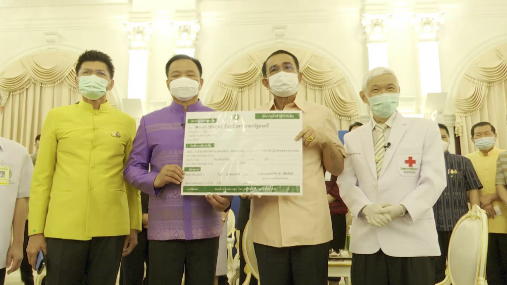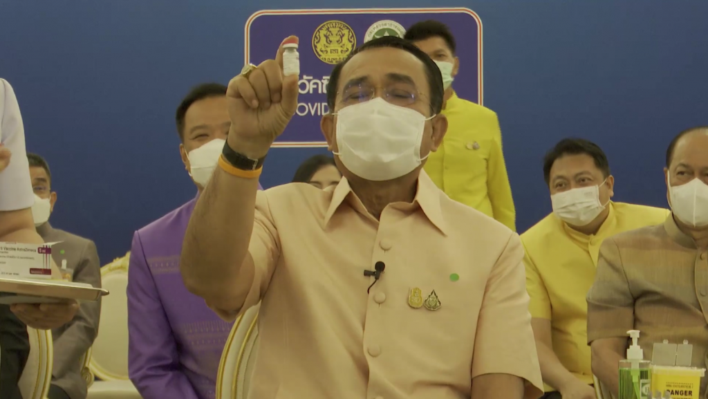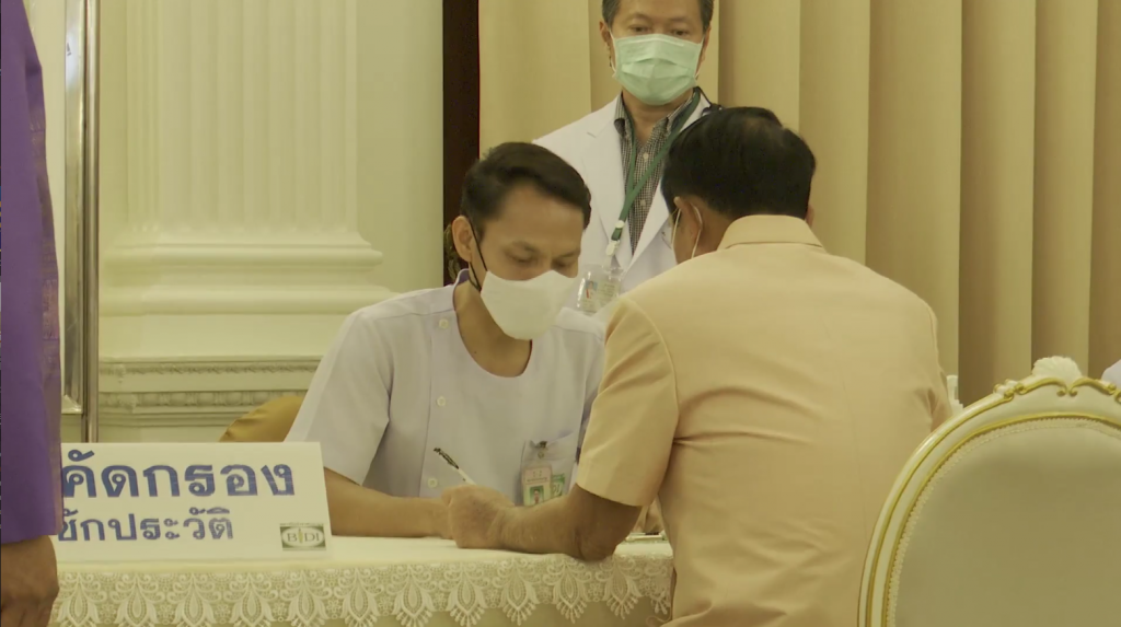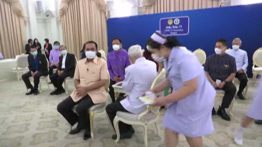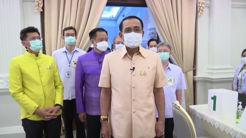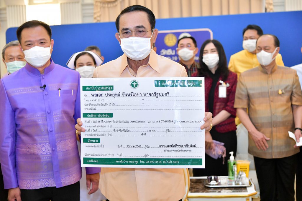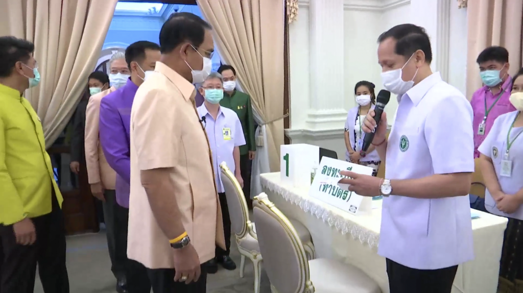 พล.อ.ประยุทธ์ จันทร์โอชา นายกรัฐมนตรีและรัฐมนตรีว่าการกระทรวงกลาโหม เข้าสู่ขั้นตอนการฉีดวัคซีน ที่จัดขึ้นในตึกสันติไมตรีหลังใน เริ่มจากการการทำประวัติ ชั่งน้ำหนัก วัดความดัน ความดันนายกรัฐมนตรีวันนี้อยู่ที่ 157/88 แพทย์ระบุว่าความดันปกติ ส่วนน้ำหนักอยู่ที่ 83.1 กิโลกรัม และวัคซีนลอตที่ A1 CTMAV509 ผู้ที่ฉีดวัคซีนให้กับนายกรัฐมนตรีคือ นายแพทย์ยง ภู่วรวรรณ ฉีดเข้าที่กล้ามแขนของนายกรัฐมนตรี โดยนายกรัฐมนตรี เตรียมพร้อมใส่เสื้อแขนสั้นมา นายกรัฐมนตรี บรรยายความรู้สึกขณะฉีด และบอกว่าฉีดไม่เจ็บ หลังฉีดนายกรัฐมนตรีกล่าวให้ความมั่นใจว่าการฉีดวันนี้เป็นการสร้างความมั่นใจให้คนไทย ว่า ฉีดวัคซีนที่รัฐบาลเตรียมไว้ เป็นวัคซีนที่เหมาะกับคนไทย โดยแอสตราเซเนกาได้รับการยืนยันจากองค์การอนามัยโลกว่าปลอดภัย จากนี้จะเพิ่มขีดความสามารถในการฉีดให้มากขึ้น ขอให้ฟังหมอเป็นหลัก กำชับประชาชนไปในพื้นที่เสี่ยง แม้จะรับวัคซีนแล้วก็ตาม และขอให้รอติดตามมาตรการผ่อนคลายในช่วงสงกรานต์ ในวันศุกร์นี้