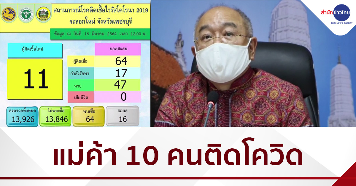 เพชรบุรี 17 มี.ค.-ผู้ว่าฯ เพชรบุรี เผยจังหวัดพบแม่ค้า 10 คน ติดโควิด-19 จากคลัสเตอร์ตลาดบางแค ส่งทั้งหมดเข้าสู่กระบวนการกักตัว พร้อมตรวจหาเชื้อกลุ่มเสี่ยงใกล้ชิดแล้ว