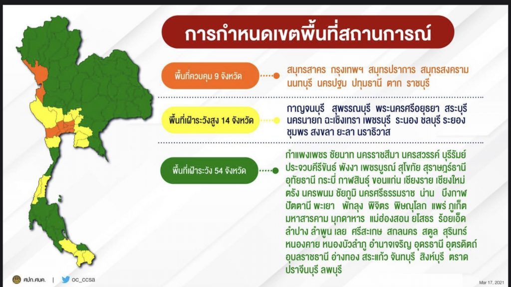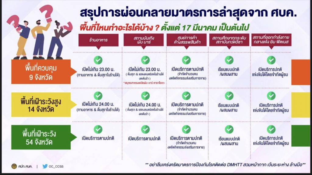 ขณะเดียวกันได้ผ่อนคลายมาตรการโควิด -19 ปรับสีในพื้นที่ต่างๆ สำคัญได้แก่ สมุทรสาคร จากสีแดงเข้ม เป็นสีส้ม รวม 9 จังหวัด ได้แก่ สมุทรสาคร กรุงเทพ นนทบุรี ปทุมธานี ราชบุรี สมุทรสงคราม สมุทรปราการ ตาก และนครปฐม ส่วนจังหวัดอื่นๆ คงเดิม ทั้งนี้การปรับระดับ และผ่อนคลายต่างๆ ต้องพิจารณาหลายชั้น เพราะบางครั้งการผ่อนคลาย อาจนำมาซึ่งการสุ่มเสี่ยง