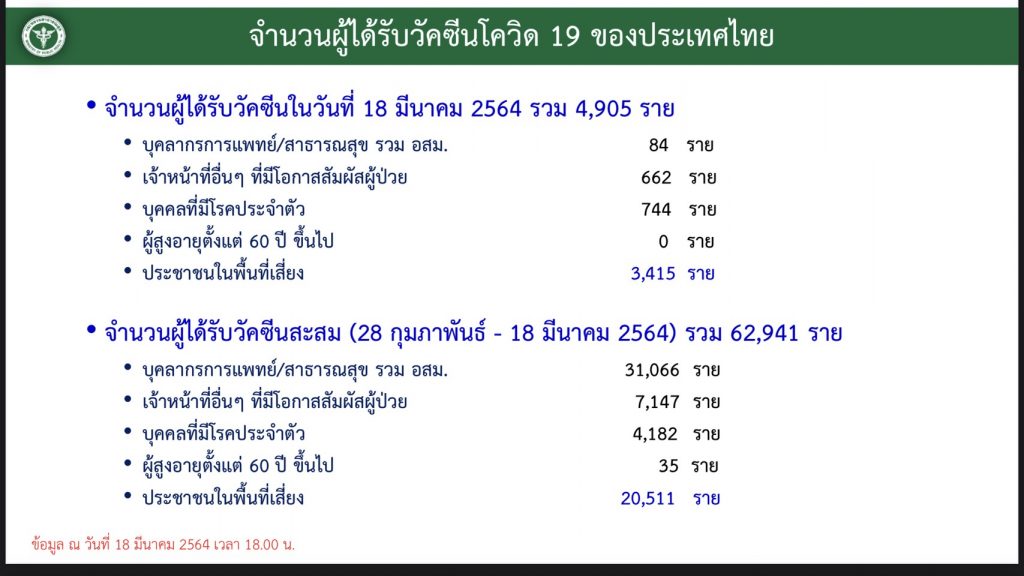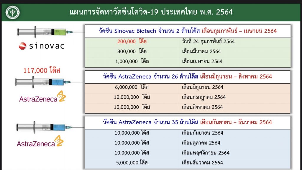 นอกจากนี้ที่ประชุม ศบค.ได้รับทราบการกระจายวัคซีน ในระยะที่ 1 คือ ตั้งแต่ 1 เมษายน- 30 มิถุนายน ซึ่งจะมีซิโนแวค 2 ล้านโดส ซึ่งตอนนี้มาแล้ว 2 แสนโดส พรุ่งนี้ (20 มี.ค.) มาอีก 8 แสนโดส โดยจะกระจายไปยัง 18 จังหวัดที่มีความสำคัญด้านเศรษฐกิจ ส่วนระยะที่ 2 เดือนกรกฎาคม – 30 กันยายน จะมีแอสตราเซเนกา มาอีก 26 ล้านโดส จากนั้น 1 ตุลาคม ระยะที่ 3 จะเป็นแอสตราเซเนกา อีก 35 ล้านโดส