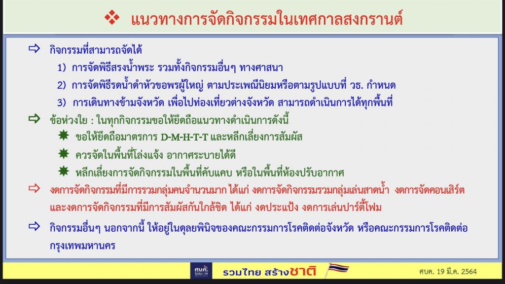 นพ.ทวีศิลป์ กล่าวอีกว่า สำหรับมาตราช่วงสงกรานต์ปีนี้ ที่ประชุม ศบค.ชุดใหญ่ ให้งดเล่นสาดน้ำสงกราต์ งดประแป้ง งดจัดการแสดงคอนเสิร์ต รวมถึงปาร์ตี้โฟม แต่อนุญาตให้เดินทางข้ามจังหวัด และทำกิจกรรมตามประเพณีได้ เช่น รดน้ำดำหัวผู้ใหญ่ สรงน้ำพระ เป็นต้น โดยในการจัดกิจกรรม ขอให้ระมัดระวังเรื่องพื้นที่ จำนวนผู้เข้าร่วม และการดื่มสุรา รวมไปถึงใปถึงการไปจับจ่ายใช้สอยในตลาด.-สำนักข่าวไทย