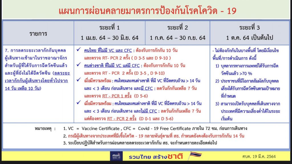 ส่วนกรณีต่างชาติที่เดินทางเข้าไทย เดิมต้องใช้ฟิตทูฟลาย และโควิดฟรี ก็จะปรับให้เหลือเพียง โควิด ฟรี เพียงอย่างเดียว ตั้งแต่ 1 เมษายนนี้ และจะลดเวลากักตัว สำหรับบุคคลทั่วไปเหลือ 10 วัน จาก 14 วัน แต่ถ้าได้รับวัคซีน และมีเอกสารรับรอง จะลดเวลากักตัวเหลือเพียง 7 วัน ทั้งนี้ สำหรับบุคคลที่เดินทางมาจากประเทศหรือพื้นที่ที่มีโควิด-19 กลายพันธุ์ ยังคงให้กักตัว 14 วันเช่นเดิม อย่างไรก็ตาม ในระหว่างเดินทางเข้าประเทศมาแล้ว และอยู่ในช่วงกักตัวก็จะเพิ่มการผ่อนคลายให้ทำกิจกรรมอื่นๆ ได้ อาทิ ออกนอกห้องพักได้ ตามเวลาและเงื่อนไขของสาธารณสุข สามารถใช้ห้องฟิตเนตได้ ออกกำลังกายกลางแจ้ง และว่ายน้ำได้ รวมถึงการปั่นจักรยานในพื้นที่ปิด และยังให้ซื้อสินค้าและอาหารจากภายนอกได้ ซึ่งหลังเดือนกรกฎาคมที่มีการกระจายวัคซีนมากขึ้น จะมีการผ่อนคลายเพิ่มอีก เช่น ให้รับประทานอาหารในห้องอาหารของโรงแรมได้ และใช้บริการนวดเพื่อสุขภาพได้ จากนั้น 1 ตุลาคม จะคงการกักตัวไว้เฉพาะบุคคลที่มาจากพื้นที่ ที่คณะกรรมการโรคติดต่อแห่งชาติ กำหนดเท่านั้น