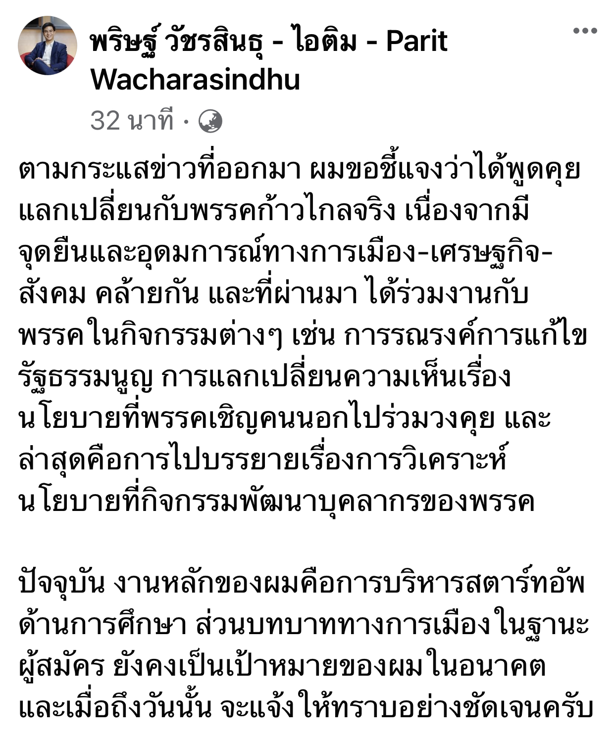 ด้านนายพริษฐ์ โพสต์ข้อความผ่านเฟสบุ๊ค พริษฐ์ วัชรสินธุ-ไอติม “Parit Wacharasindhu” ระบุว่า “ตามกระแสข่าวที่ออกมา ผมขอชี้แจงว่าได้พูดคุยแลกเปลี่ยนกับพรรคก้าวไกลจริง เนื่องจากมีจุดยืนและอุดมการณ์ทางการเมือง-เศรษฐกิจ-สังคม คล้ายกัน และที่ผ่านมา ได้ร่วมงานกับพรรคในกิจกรรมต่างๆ เช่น การรณรงค์การแก้ไขรัฐธรรมนูญ การแลกเปลี่ยนความเห็นเรื่องนโยบายที่พรรคเชิญคนนอกไปร่วมวงคุย และล่าสุดคือการไปบรรยายเรื่องการวิเคราะห์นโยบายที่กิจกรรมพัฒนาบุคลากรของพรรค