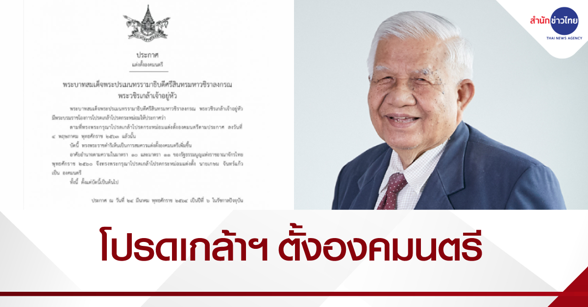 กรุงเทพฯ 24 มี.ค. – มีพระบรมราชโองการโปรดเกล้าฯ แต่งตั้ง “เกษม จันทร์แก้ว” เป็นองคมนตรี