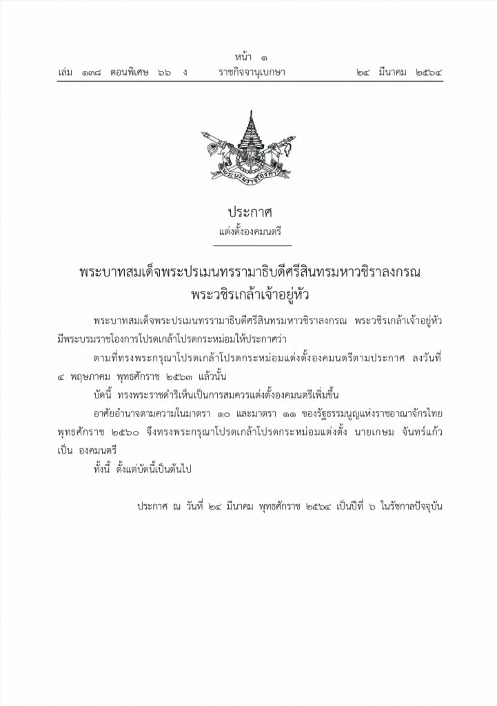ประกาศ ณ วันที่ 24 มีนาคม พุทธศักราช 2564 เป็นปีที่ 6 ในรัชกาลปัจจุบัน.-สำนักข่าวไทย