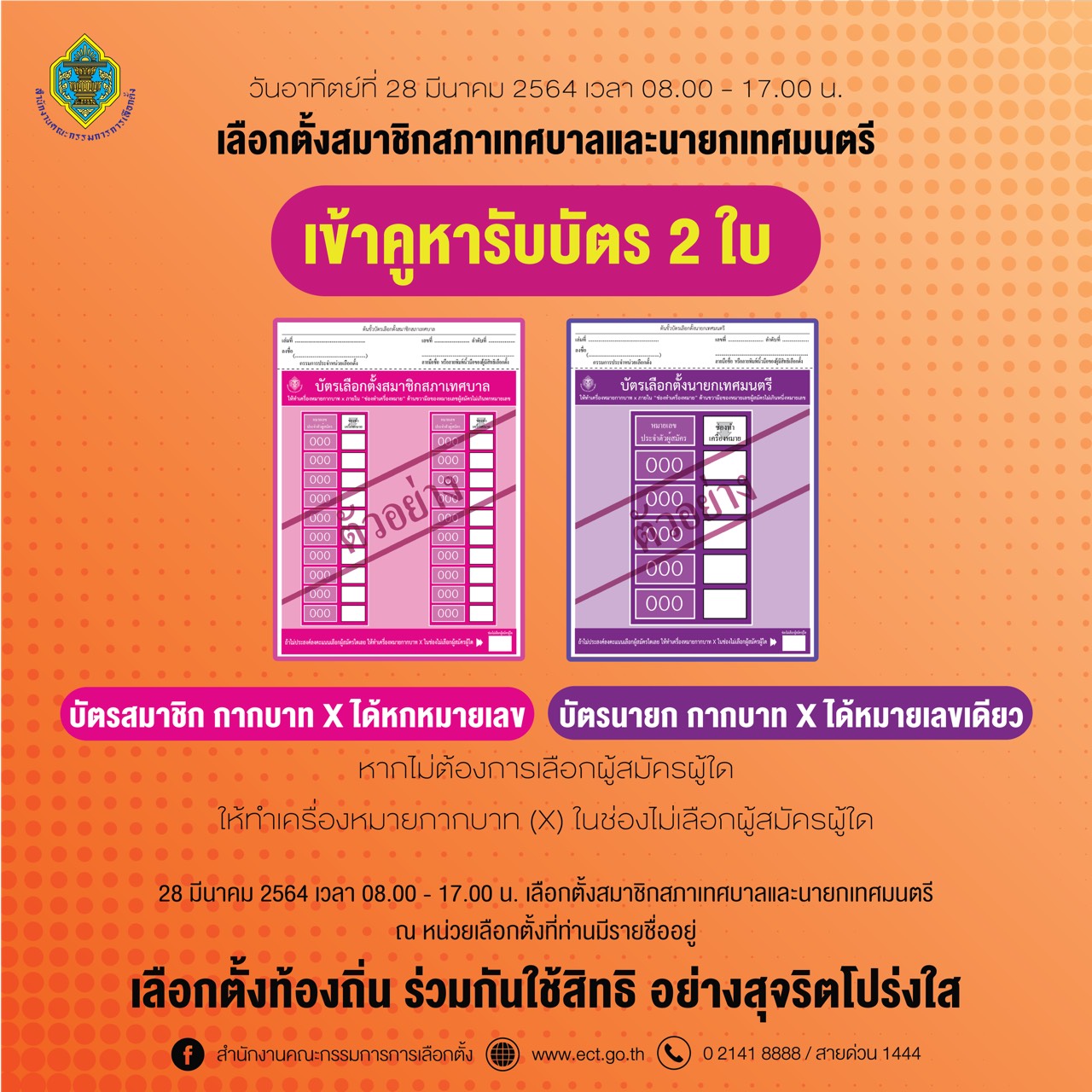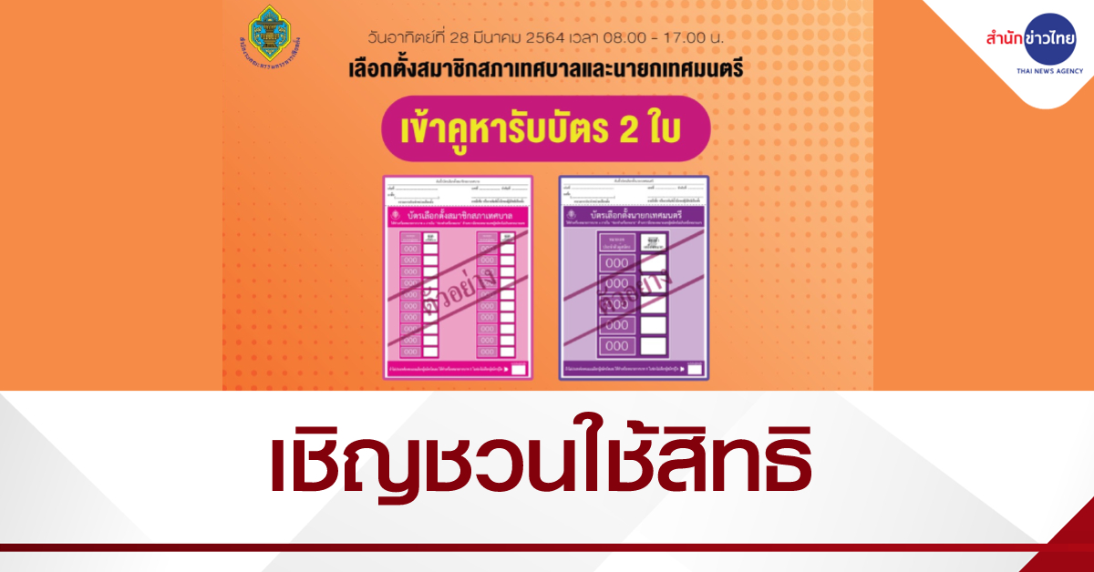 สำนักงาน กกต. ขอเชิญชวนประชาชนผู้มีสิทธิเลือกตั้งออกไปใช้สิทธิเลือกตั้ง ในวันอาทิตย์ที่ 28 มีนาคม 2564 ตั้งแต่เวลา 08.00-17.00 น. โดยเลือกผู้แทนที่มีความรู้ ความสามารถ มีคุณธรรม ไปทําหน้าที่พัฒนาท้องถิ่นอย่างแท้จริง ทั้งนี้ ก่อนออกจากบ้านอย่าลืมเตรียมบัตรประจำตัวประชาชน ซึ่งบัตรประจําตัวประชาชนที่หมดอายุ หรือหลักฐานอื่นใดของทางราชการ หรือหน่วยงานของรัฐที่มีรูปถ่าย และเลขประจําตัวประชาชน เช่น บัตรประจําตัวเจ้าหน้าที่รัฐ ใบอนุญาตขับขี่ พาสปอร์ต ก็สามารถใช้ได้