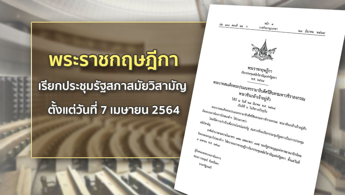 อาศัยอำนาจตามความในมาตรา 122 และมาตรา 175 ของรัฐธรรมนูญแห่งราชอาณาจักรไทย จึงทรงพระกรุณาโปรดเกล้าฯ ให้ตราพระราชกฤษฎีกาเรียกประชุมสมัยวิสามัญแห่งรัฐสภา ตั้งแต่วันที่ 7 เมษายน พุทธศักราช 2564