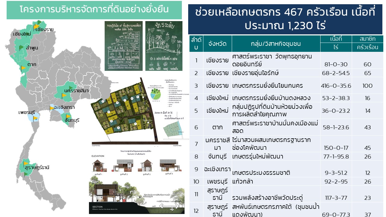 นายกุลพัชร ภูมิใจอวด ผู้อำนวยการ บจธ. กล่าวถึงความคืบหน้าการแก้ไขปัญหาที่ดินทำกินโดยการกระจายการถือครองที่ดิน เพื่อจัดหาและพัฒนาที่ดินทำกินให้แก่เกษตรกรไปแล้ว ภายใต้โครงการบริหารจัดการที่ดินอย่างยั่งยืน จำนวนกว่า 467 ครัวเรือน รวมเป็นพื้นที่กว่า 1,230 ไร่ เกษตรกรได้เพาะปลูกตามหลักปรัชญาของเศรษฐกิจพอเพียง และเกษตรทฤษฎีใหม่ มีรายได้จากผลผลิตทางการเกษตร มีความเป็นอยู่ที่ดีขึ้นเห็นภาพอย่างเป็นรูปธรรม ชุมชนเข้มแข็งได้โดยชุมชน