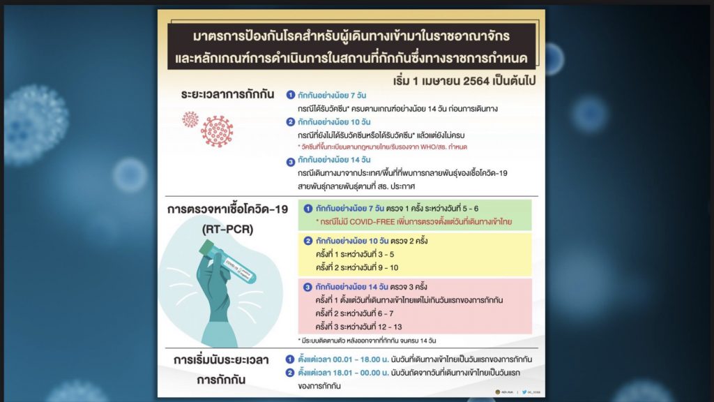 3 กลุ่มนี้หากเดินทางถึงไทยเวลา 18.00 น.ให้นับเป็นวันที่ 1 ของการกักตัว แต่หากเดินทางถึงไทยเวลา 19.00 น. ให้นับวันรุ่งขึ้นเป็นวันกักตัววันที่ 1 ขณะที่การตรวจหาเชื้อก่อนเดินทางเข้าไทยสำหรับต่างชาติจะต้องมีผลเป็นลบ สำหรับกลุ่มแรกที่ต้องกักตัว 7 วัน จะถูกตรวจหาเชื้อโควิดในวันที่ 5-6 ส่วนคนไทยที่ไม่ได้รับการตรวจหาเชื้อ เมื่อเดินทางถึงประเทศไทยจะต้องได้รับการ Swab ตั้งแต่เดินทางมาถึง และตรวจอีกครั้งเมื่อวันที่ 5-6
