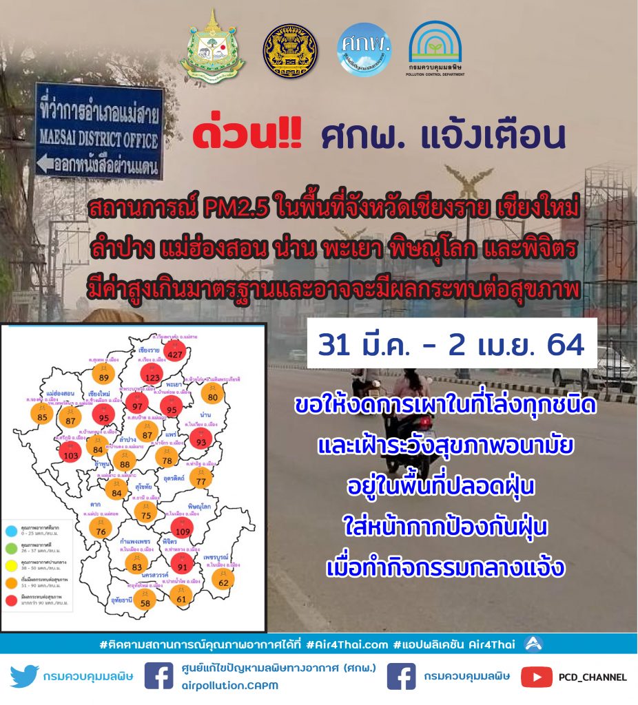 เนื่องจากสถานการณ์ปัจจุบันพบสูงเกินเกณฑ์มาตรฐานรวม 25 พื้นที่ และอยู่ในเกณฑ์มีผลกระทบต่อสุขภาพ 9 พื้นที่ พบปริมาณฝุ่นละอองสูงสุดที่ อำเภอแม่สาย จังหวัดเชียงราย ตรวจวัดได้ 427 ไมโครกรัมต่อลูกบาศก์เมตร ประชาชนทั่วไปและกลุ่มเสียงควรหลีกเลี่ยงกิจกรรมกลางแจ้งทุกประเภท ใช้อุปกรณ์ป้องกันตนเองเมื่ออยู่ในพื้นที่มีมลพิษทางอากาศสูง หากมีอาการทางสุขภาพรุนแรงควรปรึกษาแพทย์ พื้นที่ภาคเหนือยังต้องเฝ้าระวังเป็นพิเศษ ถึงแม้ว่าจุดความร้อนในพื้นที่ภาคเหนือลดลงอย่างต่อเนื่อง แต่พบแนวโน้มการเพิ่มขึ้นฝุ่น PM2.5 เนื่องจากสภาพอุตุนิยมวิทยาในภาคเหนือมีความเร็วลมต่ำ ไม่เอื้ออำนวยในการระบายฝุ่นออกจากพื้นที่ ประกอบอิทธิพลของลมตะวันตกเฉียงใต้ที่พัดฝุ่นจากประเทศเพื่อนบ้านเข้ามาสะสมเพิ่ม ทำให้สถานการณ์ฝุ่นในพื้นที่ภาคเหนือเกินมาตรฐาน ทางกรมควบคุมมลพิษ กระทรวงทรัพยากรธรรมชาติและสิ่งแวดล้อม และหน่วยงานที่เกี่ยวข้อง จึงได้ร่วมกันบูรณาการแก้ปัญหาช่วยเหลือประชาชน ตามสั่งการของรองนายกรัฐมนตรี พลเอกประวิตร วงษ์สุวรรณ ที่มีความห่วงใยต่อสุขภาพของพี่น้องประชาชน ให้สำเร็จลุล่วงโดยเร็วที่สุด