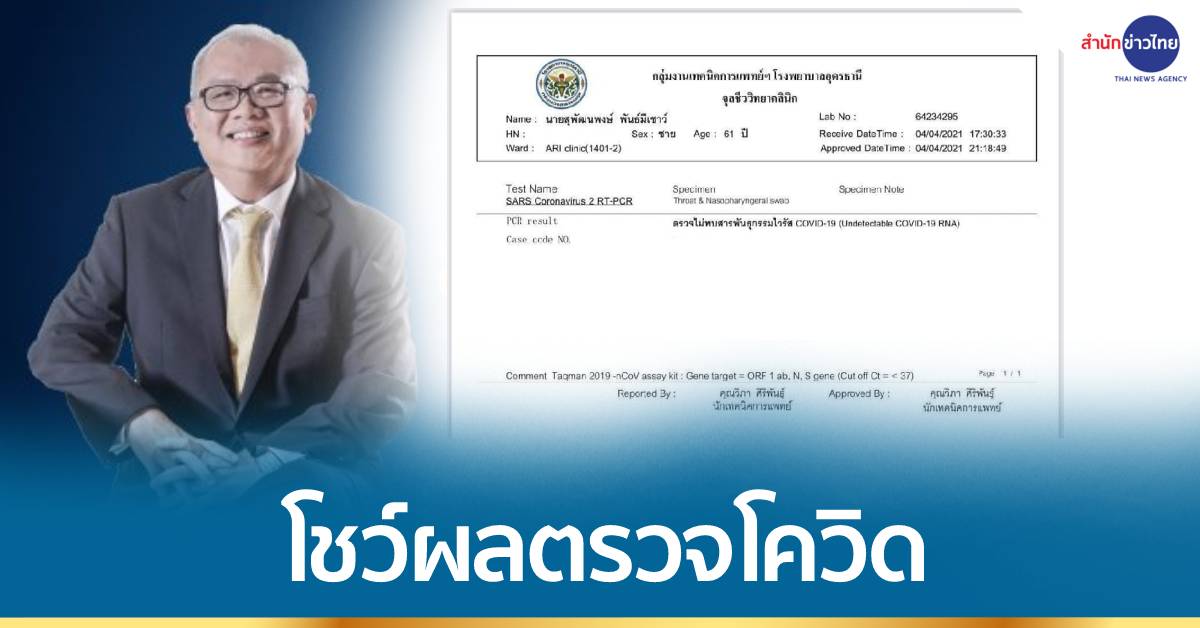กทม. 5 เม.ย.-“สุพัฒนพงษ์” รองนายกฯ โชว์ผลตรวจโควิด เป็นลบ หลังถูกโยงเคสทองหล่อ ยันไม่กังวลกับข่าว เพราะรู้ดีว่าไม่เป็นความจริง