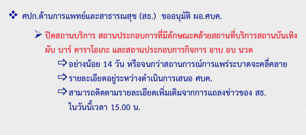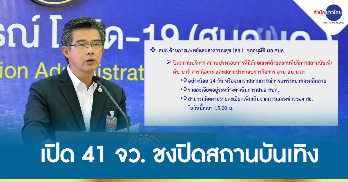 นพ.ทวีศิลป์ วิษณุโยธิน โฆษก ศบค. เผย ศปก.ด้านการแพทย์และสาธารณสุข (สธ.) ขออนุมัติ ผอ.ศบค. ให้ปิดสถานบริการ สถานประกอบการที่มีลักษณะคล้ายสถานที่บริการสถานบันเทิง ผับ บาร์ คาราโอเกะ และสถานประกอบกิจการ อาบ อบ นวด ใน 41 จังหวัด