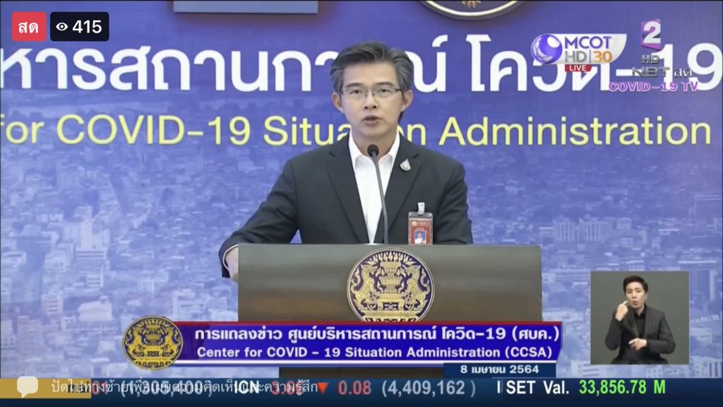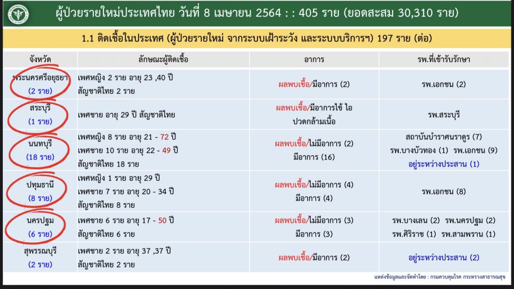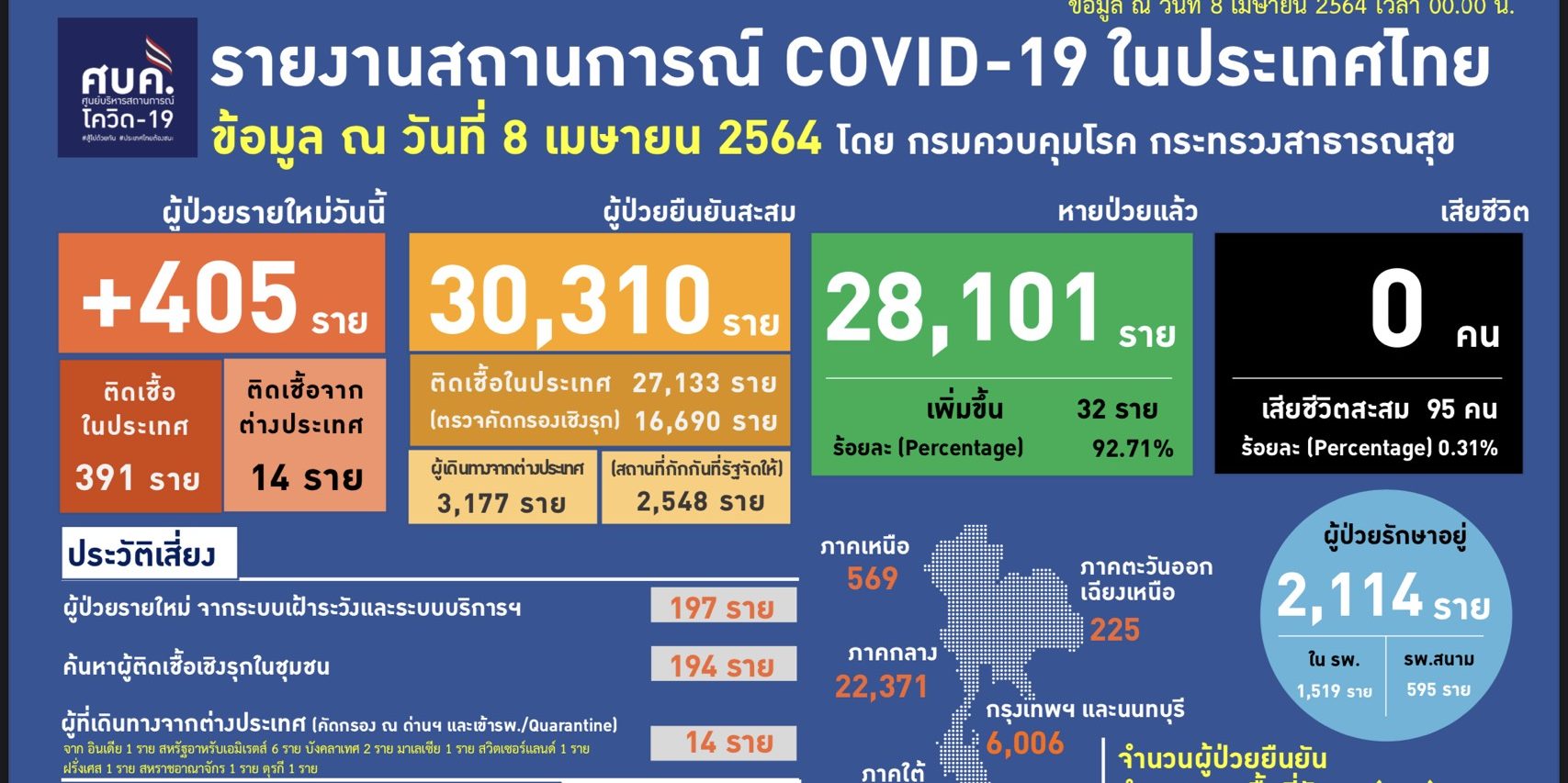 ทำเนียบฯ 8 เม.ย. – ศบค. เผยพบผู้ติดเชื้อรายใหม่พุ่ง 405 ราย ติดเชื้อในประเทศ 319 ราย เชื่อมโยงสถานบันเทิง 16 จังหวัด