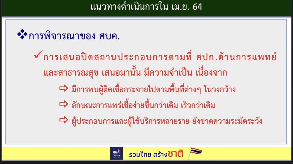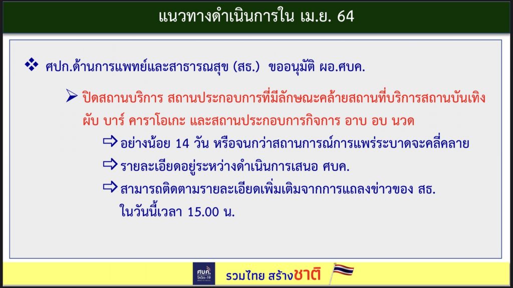 ศปก.ด้านการแพทย์และสาธารณสุข ขออนุมัติ ผอ.ศบค.ถึงมาตรการที่จะทำ โดยวันที่ 22 มี.ค.- 7 เม.ย. พบว่ามีผู้ติดโควิดจากสถานบันเทิง 504 รายเท่านั้น จึงจะไม่ใช้ยาแรงที่กระทบต่อคนจำนวนมาก จะให้ยาเฉพาะจุด ให้ปิดสถานบริการ และสถานประกอบการที่คล้ายสถานบันเทิง ผับ บาร์ คาราโอเกะ และสถานประกอบการกิจการอาบ อบ นวด จำนวน 41 จังหวัด ซึ่งจะพิจารณาจากจังหวัดที่มีผู้ติดเชื้อ โดยจะปิดอย่างน้อย 14 วัน ทั้งนี้จะเสนอเข้าที่ประชุม ศบค.ชุดเล็ก ในวันพรุ่งนี้ (9 เม.ย.)