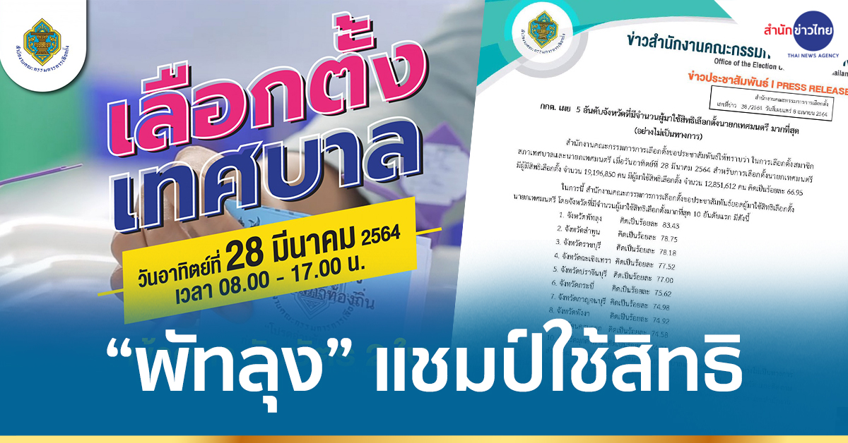 กรุงเทพฯ 8 เม.ย.-กกต. เผย 5 อันดับจังหวัดที่มีผู้ใช้สิทธิเลือกตั้งนายกเทศมนตรีมากที่สุด “พัทลุง” ชนะเลิศมากสุดร้อยละ 83.43 ยอดใช้สิทธิเลือกนายกเทศมนตรี ร้อยละ 66.95