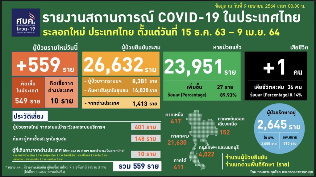ส่วนผู้ป่วยยืนยันสะสมรอกใหม่ ตั้งแต่วันที่ 15 ธันวาคม 2563 – 9 เมษายน 2564 จำนวน 26,073 ราย โดยผู้ติดเชื้อที่เพิ่มขึ้น 559 ราย เป็นผู้ที่ติดเชื้อในประเทศ 549 ราย เป็นผู้ป่วยรายใหม่จากระบบเฝ้าระวังและบริการ 401 ราย, จากการค้นหาเชิงรุกในชุมชน 148 ราย เป็นผู้ที่เดินทางจากต่างประเทศ 10 ราย เดินทางจาก สหราชอาณาจักร 1 ราย, สหรัฐอเมริกา 1 ราย, อินโดนีเซีย 1 ราย, ฝรั่งเศส 1 ราย, จีน 2 ราย, เอสโตเนีย 1 ราย, มาเลเซีย 1 ราย, เบลเยียม 2 ราย