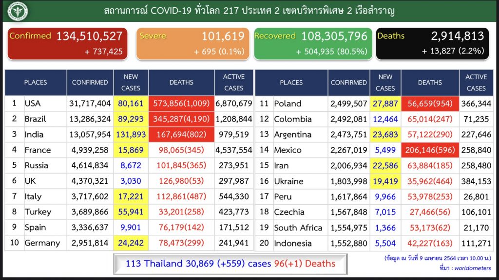 สำหรับสถานการณ์ผู้ติดเชื้อทั่วโลกผู้ติดเชื้อแล้วกว่า 134 ล้านราย ผู้เสียชีวิตสะสม 2.9 ล้านราย สหรัฐอเมริกายังเป็นประเทศที่มีผู้ติดเชื้อมากที่สุด 31.7 ล้านราย, ตามด้วยบราซิล 13.2 ล้านราย, อินเดีย 13 ล้านราย, ฝรั่งเศส 4.9 ล้านราย, รัสเซีย 4.6 ล้านราย, สหราชอาณาจักร 4.3 ล้านราย โดยประเทศไทยอยู่ในลำดับที่ 113