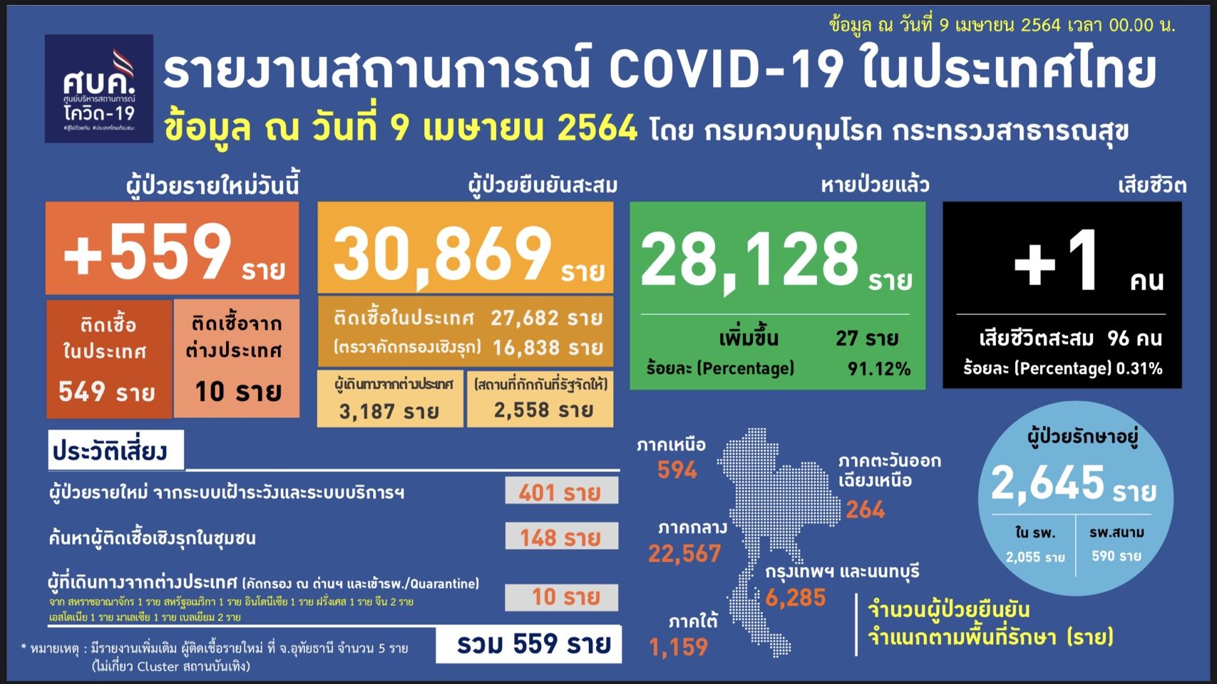 พญ.พรรณประภา ยงตระกูล ผู้ช่วยโฆษกศูนย์บริหารสถานการณ์การแพร่ระบาดของโรคติดเชื้อไวรัสโคโรนา 2019 (โควิด-19) หรือ ศบค. รายงานตัวเลขผู้ติดเชื้อโควิด 19 วันนี้ เพิ่มขึ้น 559 ราย ผู้ป่วยยืนยันสะสม 30,869 ราย หายป่วยแล้ว 28,128 ราย รักษาตัวอยู่ที่โรงพยาบาล 2,645 รายเสียชีวิตเพิ่ม 1 คน ผู้เสียชีวิตสะสมรวม 96 คน