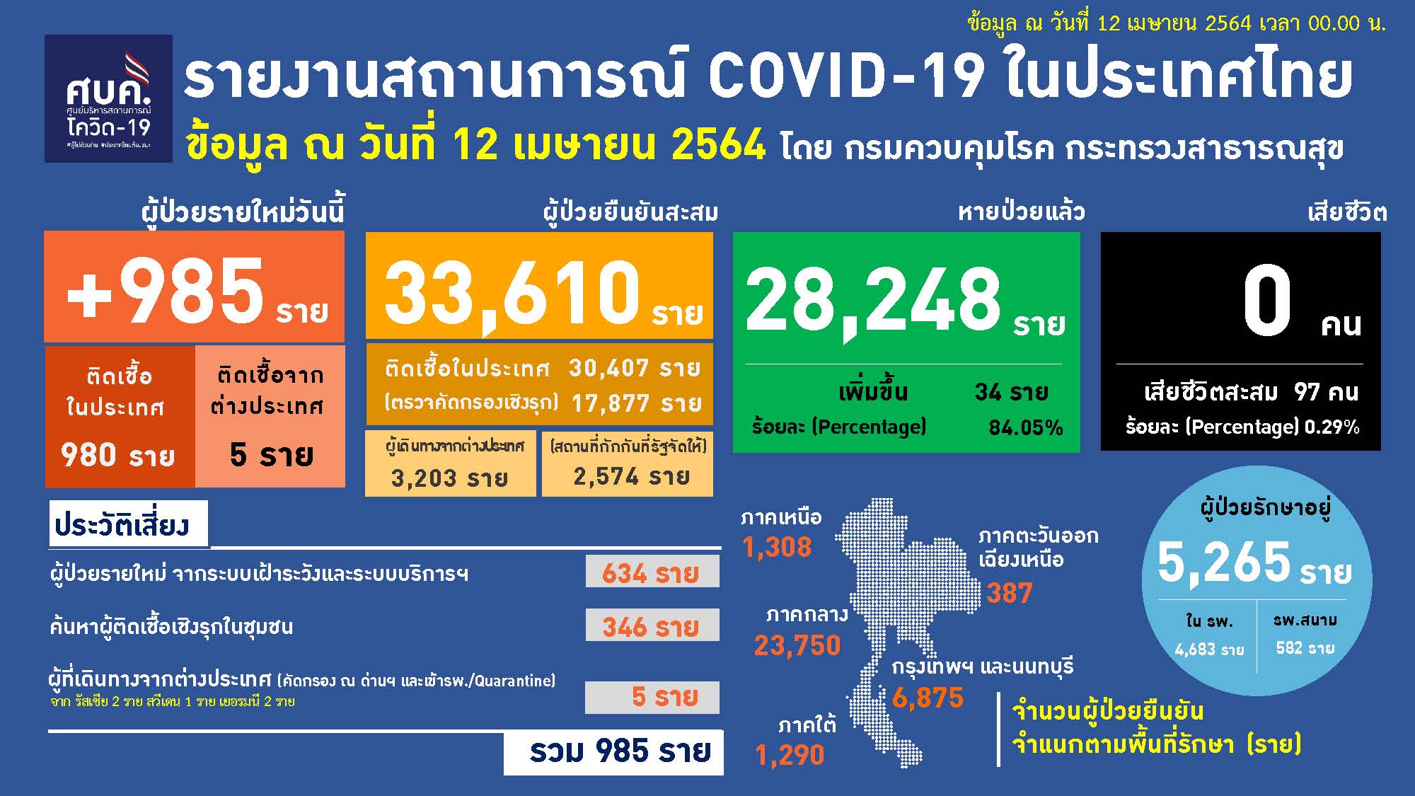 ศูนย์ข้อมูล COVID-19 รายงานสถานการณ์การติดเชื้อโควิด-19 ในประเทศประจำวันที่ 12 เมษายน 2564 ผู้ป่วยรายใหม่ 985 ราย ผู้ป่วยยืนยันสะสม 33,610 ราย หายป่วยเพิ่ม 34 สะสมแล้ว 28,248 ราย เสียชีวิตสะสม 97 ราย ยังรักษาตัวอยู่ 5,265 ราย