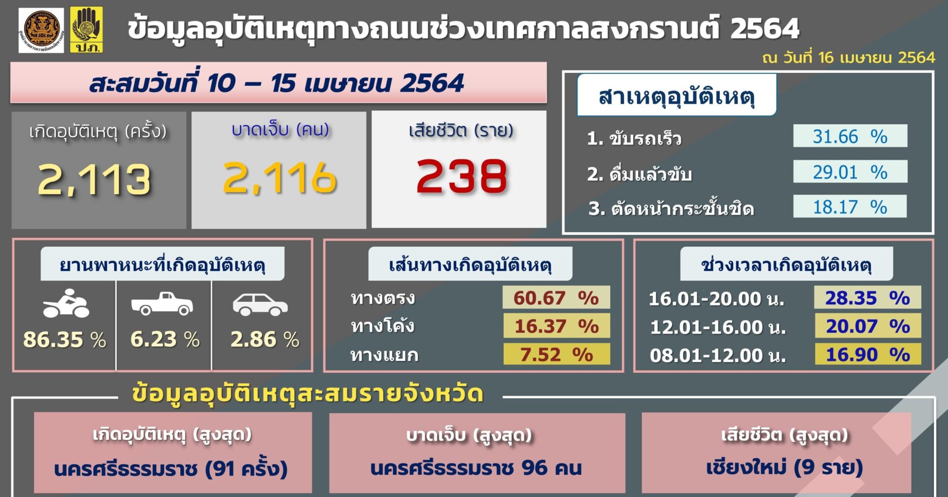 ศปถ. 16 เม.ย.-ศปถ.สรุปสถิติอุบัติเหตุทางถนน 10 – 15 เม.ย.เกิดอุบัติเหตุ 2,113 ครั้ง เสียชีวิต 238 ราย เจ็บ 2,116 คน ประสานจังหวัดเพิ่มความเข้มดูแลเส้นทางขากลับกทม. เส้นทางมุ่งจังหวัดใหญ่ เน้นตั้งจุดตรวจ เรียกตรวจถี่เส้นทางตรง