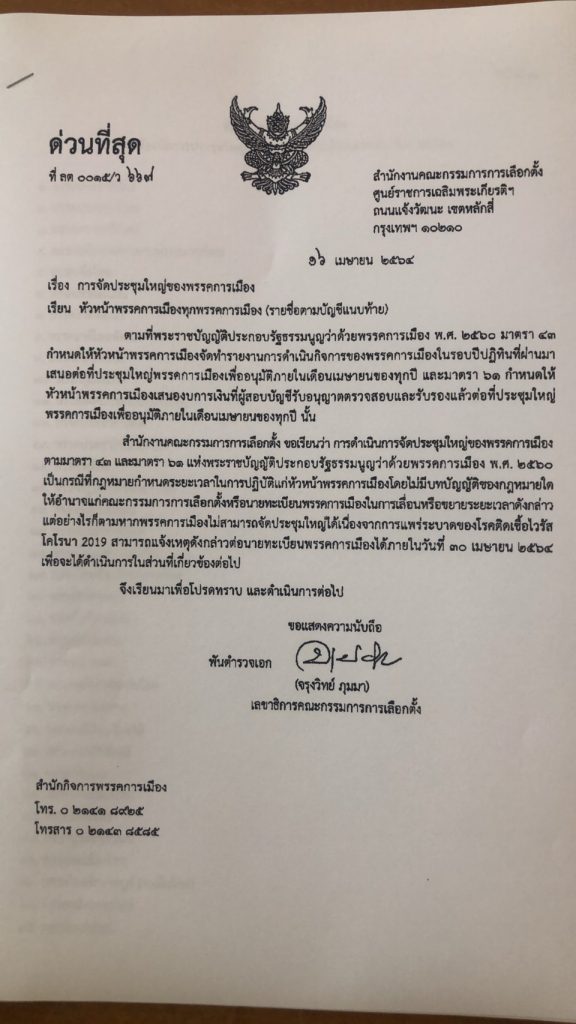กกต. 16 เม.ย. – พ.ต.อ.จรุงวิทย์” ลงนามถึงพรรคการเมือง แจ้งเหตุไม่สามารถจัดประชุมใหญ่ หลังโควิด-19 ระบาดหนัก ภายใน 30 เม.ย.นี้