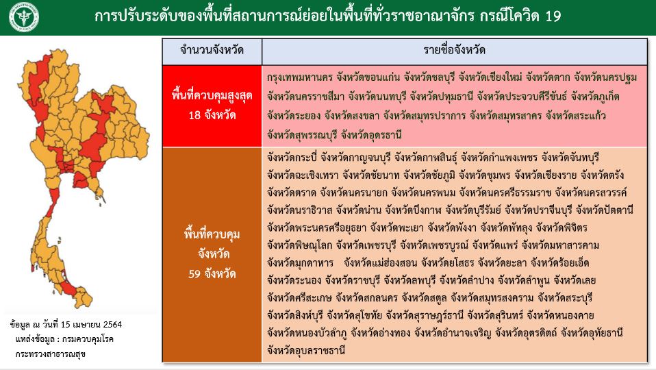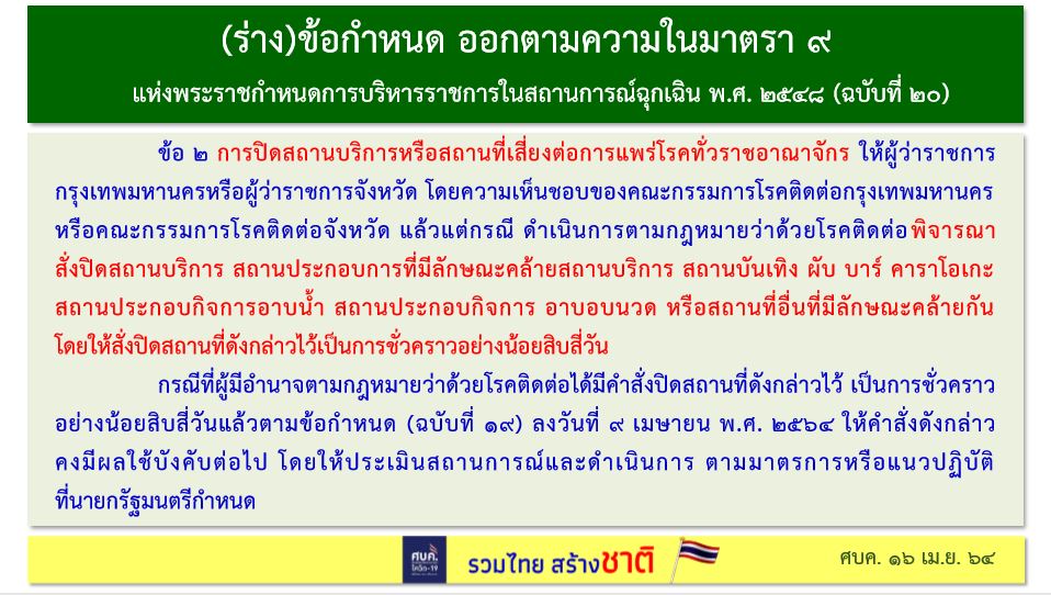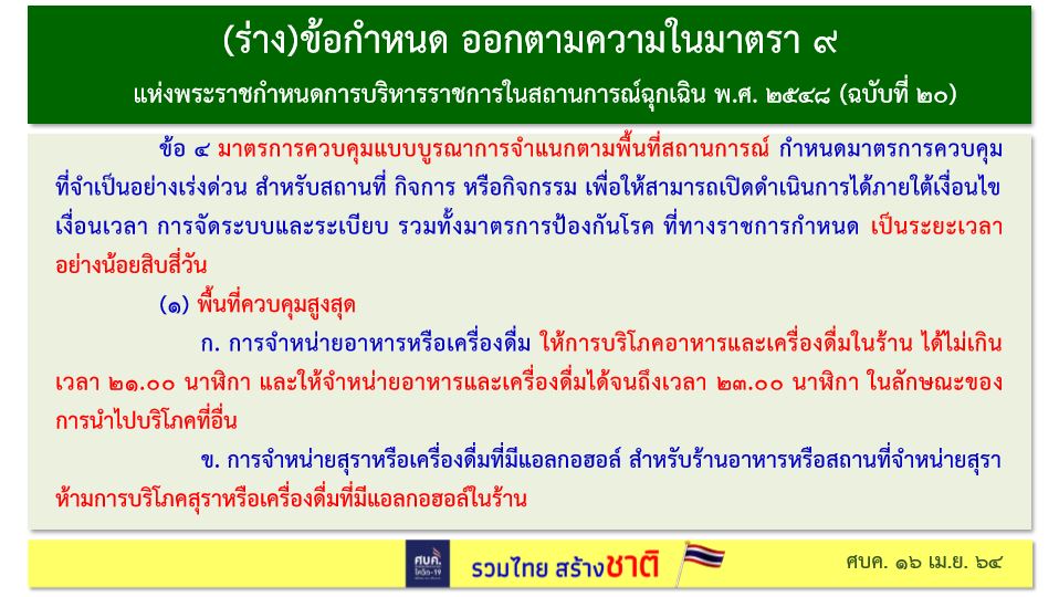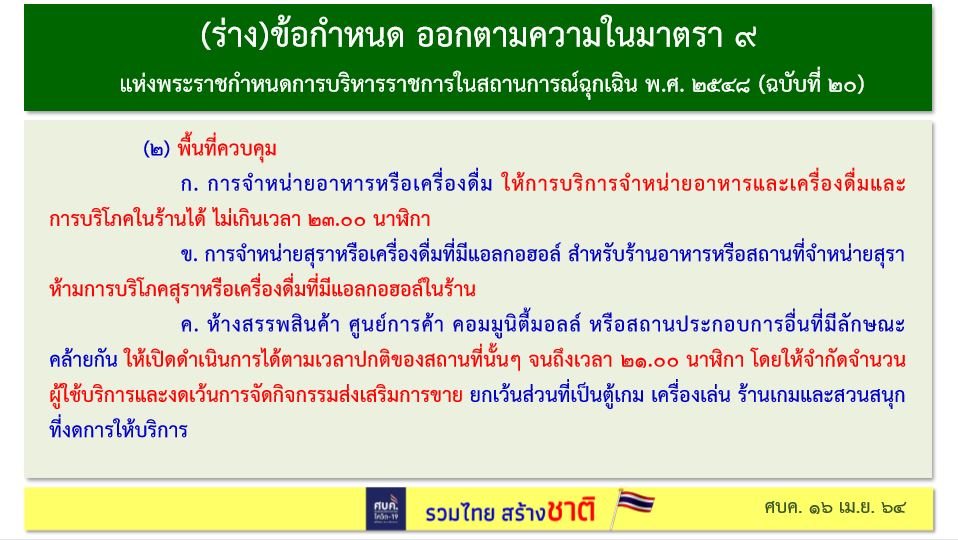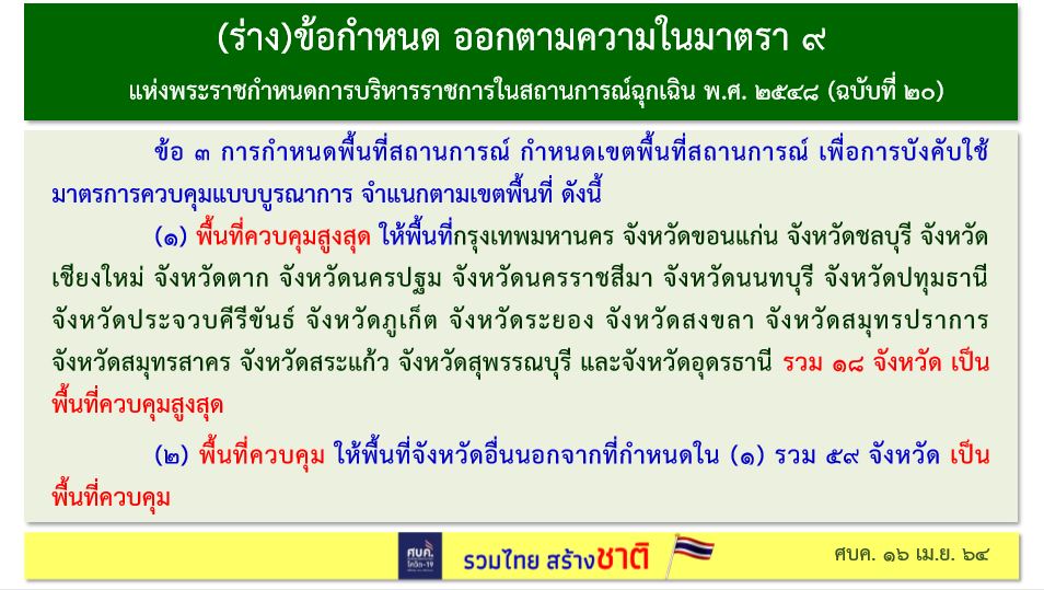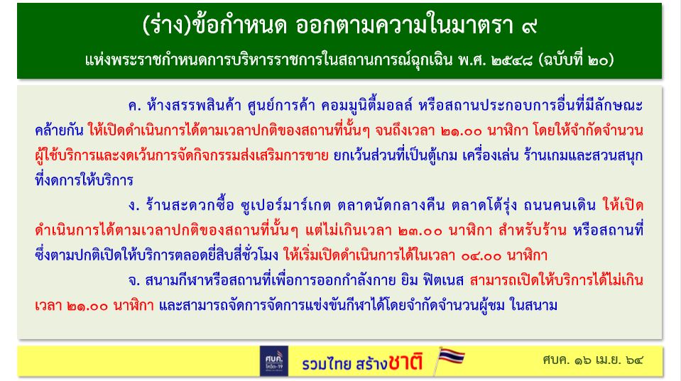 กทม. 16 เม.ย.-มติที่ประชุม ศบค.ชุดใหญ่ เห็นชอบให้ ปิดสถานบันเทิง ลดเคลื่อนย้าย ปรับเวลาเปิด-ปิดห้างร้าน “ไม่เคอร์ฟิว ไม่ล็อกดาวน์” ให้ปฏิบัติตามมาตรการพื้นที่สี เริ่มตั้งแต่ 18 เมษายน – 2 พฤษภาคม 2564.-สำนักข่าวไทย